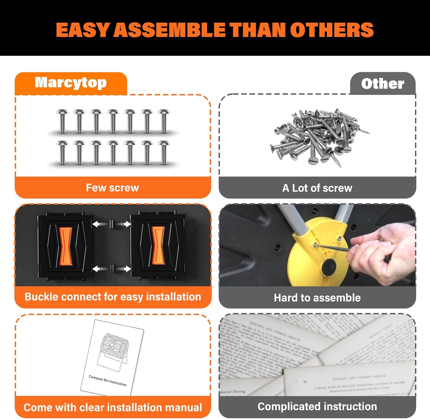 • Easy Assembly: Comes with all the necessary accessories and clear instructions to help you quickly and easily complete the assembly process. The Compost Tumbler is connected using buckles and fewer screws, ensuring a convenient and efficient installation. (About 30 minutes)