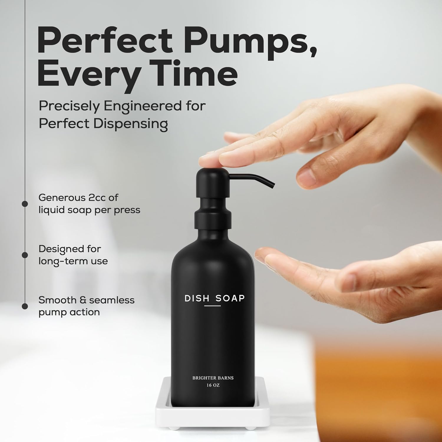 • AMERICAN DESIGN, UNCOMPROMISING QUALITY - Crafted with meticulous attention to detail, our glass soap dispenser with pump set features 2 robust 16oz glass bottles, corrosion-proof 304G stainless steel pumps, and a stain-resistant ceramic tray. All designed in the USA to provide unbeatable quality and enduring style that you can trust.