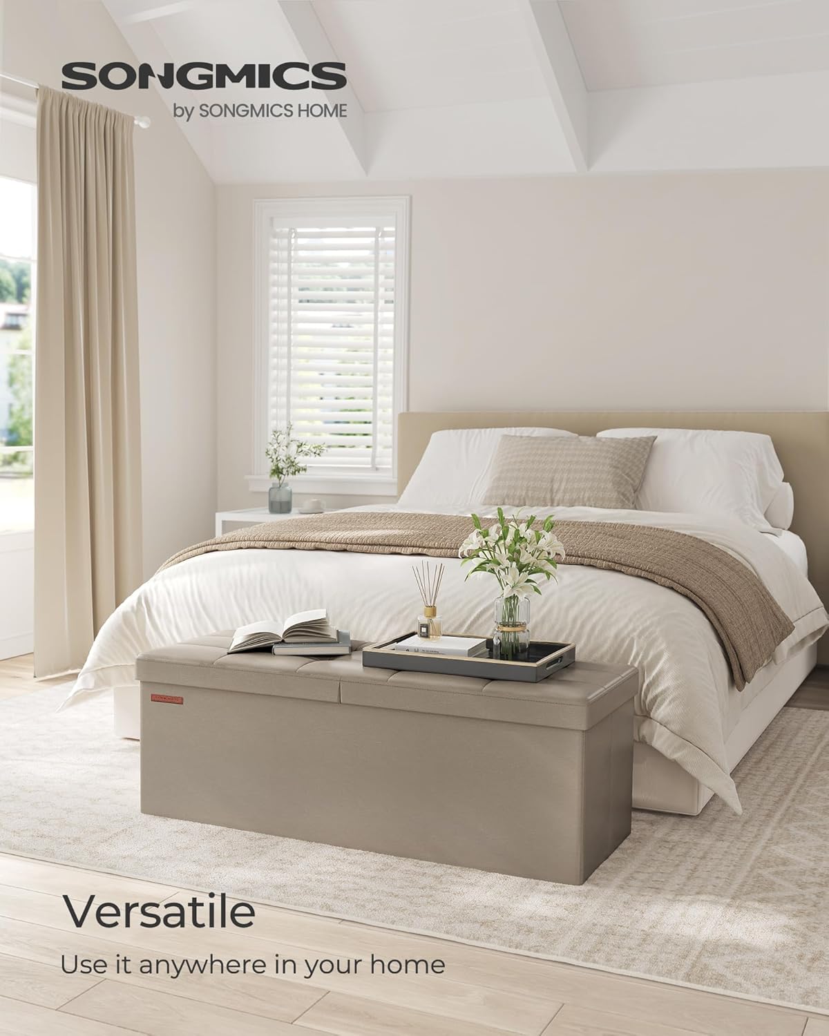 • 【QUICK ASSEMBLY, EASY FOLDAWAY】This storage ottoman from the SONGMICS MAZIE Collection has a foldable design that allows quick setup in seconds by simply inserting the bottom panel. Easily fold and store it under the bed or in a closet when not in use