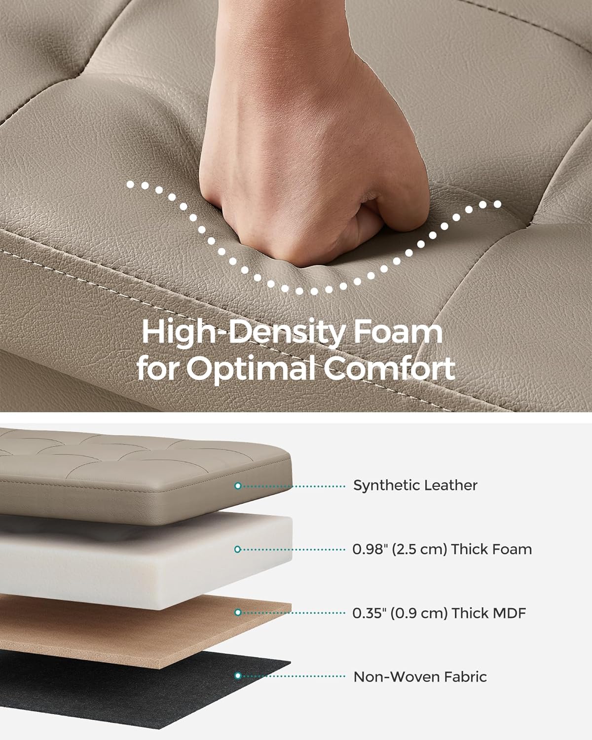 • 【COMFORTABLE SITTING, EFFORTLESS CLEANING】Padded with high-density foam, this storage bench is resistant to deformation, ensuring a soft seating experience. The synthetic leather surface makes cleaning a breeze—just a gentle wipe with a cloth