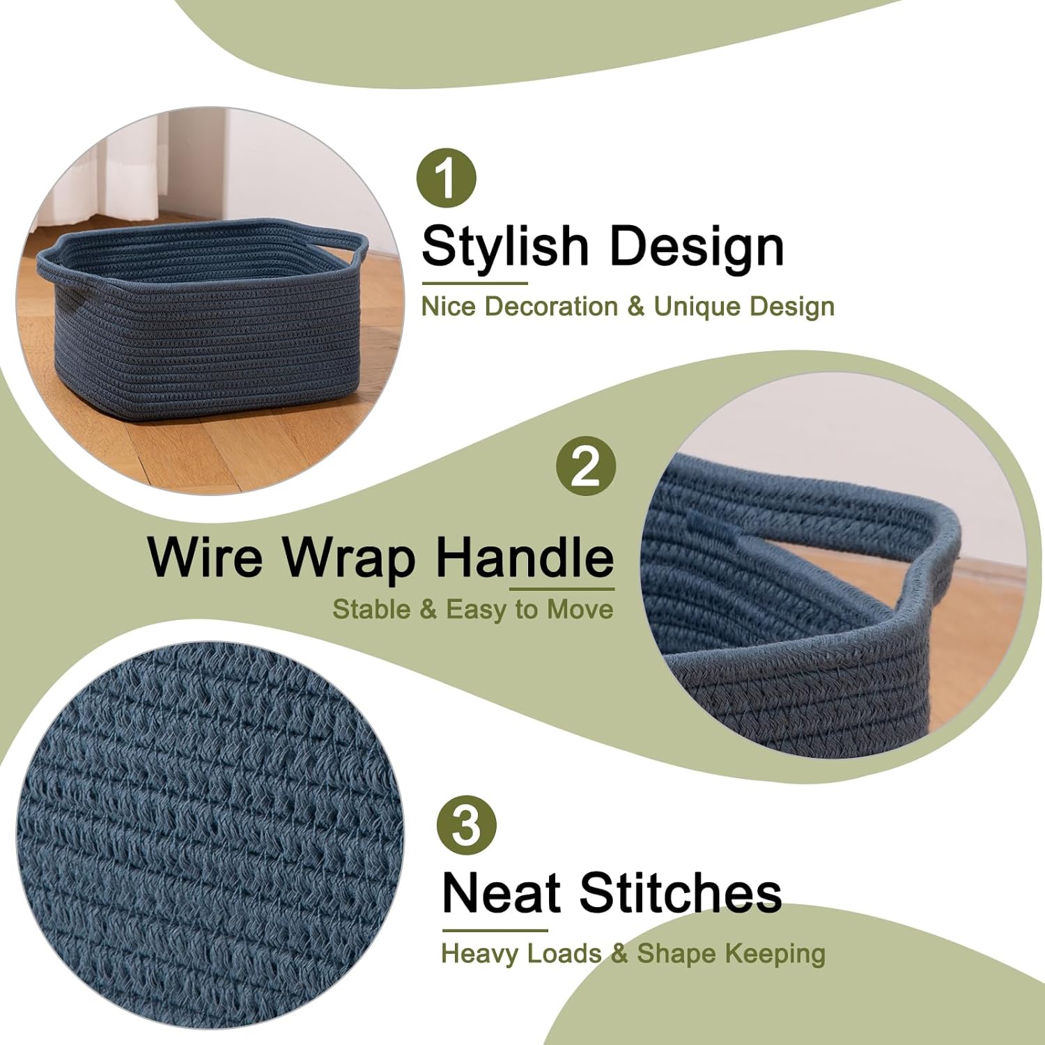 OIAHOMY Cotton Rope Woven Baskets for Storage, Nursery Rectangle Storage Basket with Handles for Shelves, Pack of 3, Blue