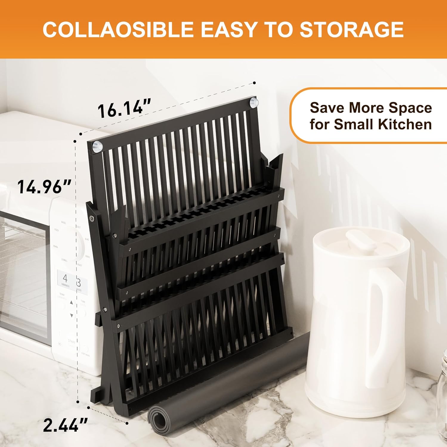 • Large Capacity: This beautifully bamboo dish drying rack for kitchen counter accommodates your complete dishes set - including dinner plates, cups, forks, and spoons. Keep your counter tidy and not cluttered. A foldable dish drying rack allows you to efficiently dry your dishes, mugs, pots and pans. dish racks for kitchen counter designed for maximum capacity and ultra-convenience. 3 tiers and 18 slots are perfect for 18 full-size square or round plates, cups, and even a cutting board
