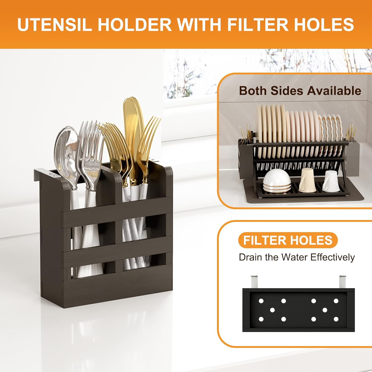 • Utensil Holder: Size: 5.91’’×2.36’’×5.98’’. The utensil rack is a handy organizer that holds flatware and cooking utensils which can be hung oneither side of the bamboo dish drying rack for kitchen counter with metal hooks. Reliable and strong, will not fall. You can put knives and forks. Our utensil holder can hold 20+ knives, forks and spoons, or cleaning brushes. Filter holes on the bottom drain the water effectively