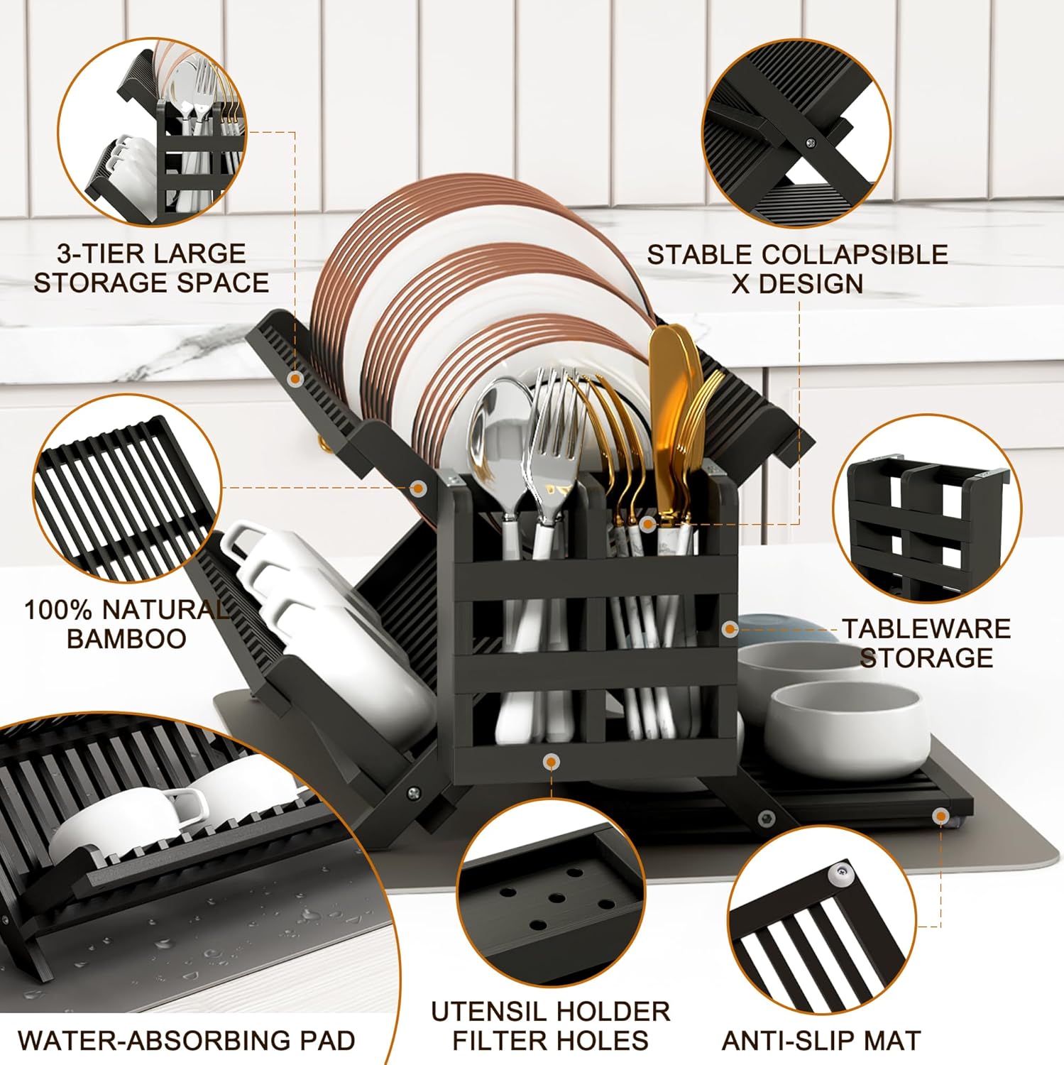 Greenual Black Bamboo Dish Drying Rack with Utensil Holder, 3 Tier Collapsible Dish Rack, Wooden Dish Racks for Kitchen Counter, Large Folding Drying Holder with Absorbent Dish Drying Mat