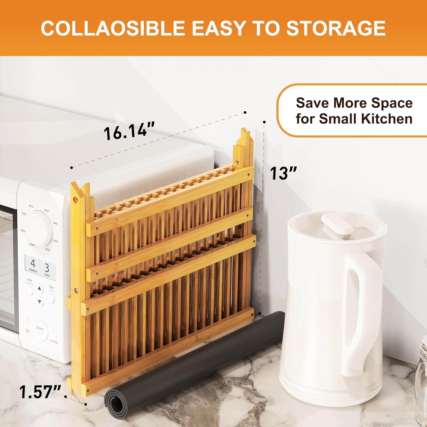 • Large Capacity: This beautifully bamboo dish drying rack for kitchen counter accommodates your complete dishes set - including dinner plates, cups, forks, and spoons. Keep your counter tidy and not cluttered. A foldable dish drying rack allows you to efficiently dry your dishes, mugs, pots and pans. dish racks for kitchen counter designed for maximum capacity and ultra-convenience. 2 tiers and 18 slots are perfect for 18 full-size square or round plates, cups, and even a cutting board