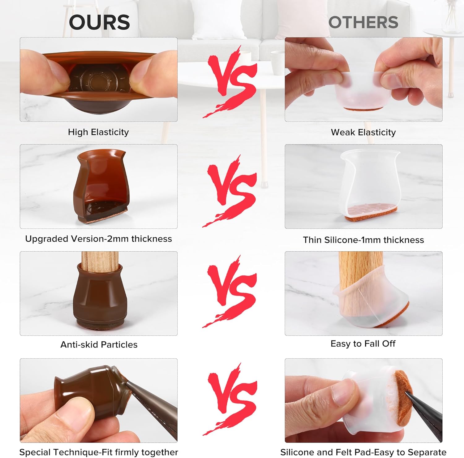 • ✅【Latest Upgrade】Compared with most of the traditional 1mm furniture pads on the market, our silicone chair leg protectors are made of 2mm thick silicone, which will never be damaged, durable. The ruby for chair legs will not change color when stretched. Inside of the inner sleeves are particles with anti-slip, which will firmly fix the chair and never make the covers fall off. Felt pads at the bottom make your furniture move silently and smoothly along floors without leaving marks and noise.