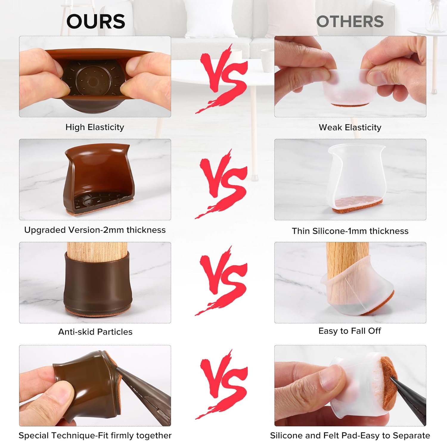 • ✅【Latest Upgrade】Compared with most of the traditional 1mm furniture pads on the market, our silicone chair leg protectors are made of 2mm thick silicone, which will never be damaged, durable. The ruby for chair legs will not change color when stretched. Inside of the inner sleeves are particles with anti-slip, which will firmly fix the chair and never make the covers fall off. Felt pads at the bottom make your furniture move silently and smoothly along floors without leaving marks and noise.