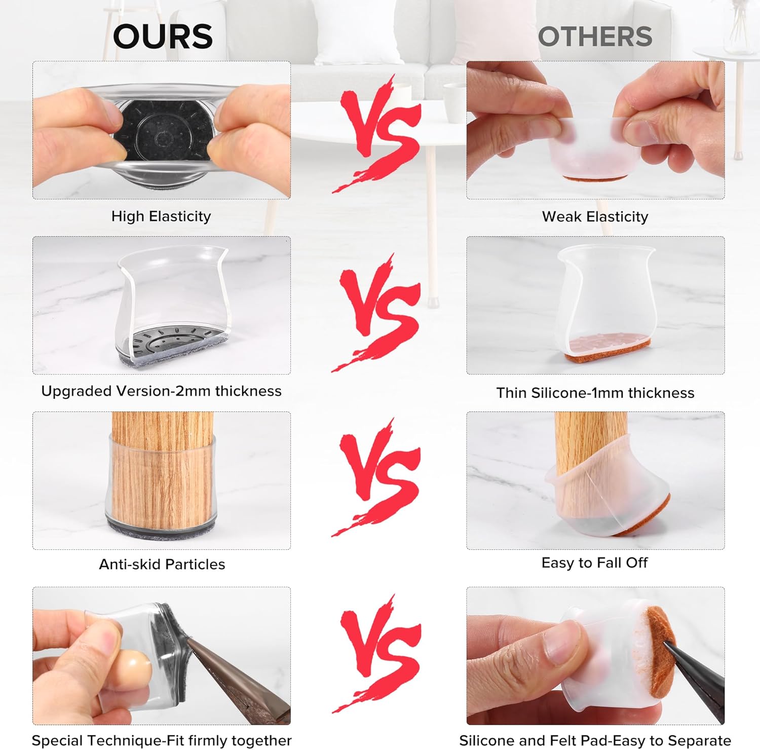 • ✅【Latest Upgrade】Compared with most of the traditional 1mm furniture pads on the market, our silicone chair leg protectors are made of 2mm thick silicone, which will never be damaged, durable. The ruby for chair legs will not change color when stretched. Inside of the inner sleeves are particles with anti-slip, which will firmly fix the chair and never make the covers fall off. Felt pads at the bottom make your furniture move silently and smoothly along floors without leaving marks and noise.