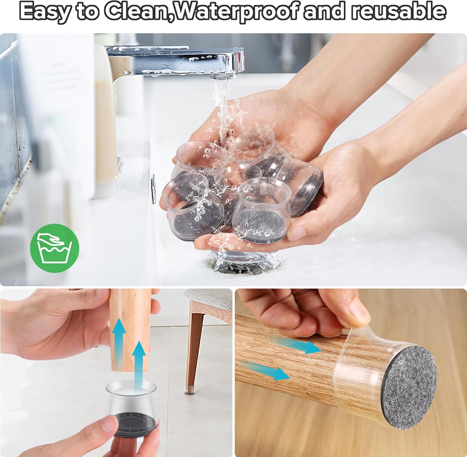 • ✅【Easy to Use】The chair leg covers to protect floors has high transparency, which greatly restore the original color of the table and chair legs, look more natural. The furniture leg cap is easy to install, without the use of tools. When the furniture chair socks are dirty, the chair stoppers can be cleaned and used repeatedly. Mainly suitable for smooth floors such as hardwood, tile, composite floor, and vinyl floor. Clear cap style match with most floors.