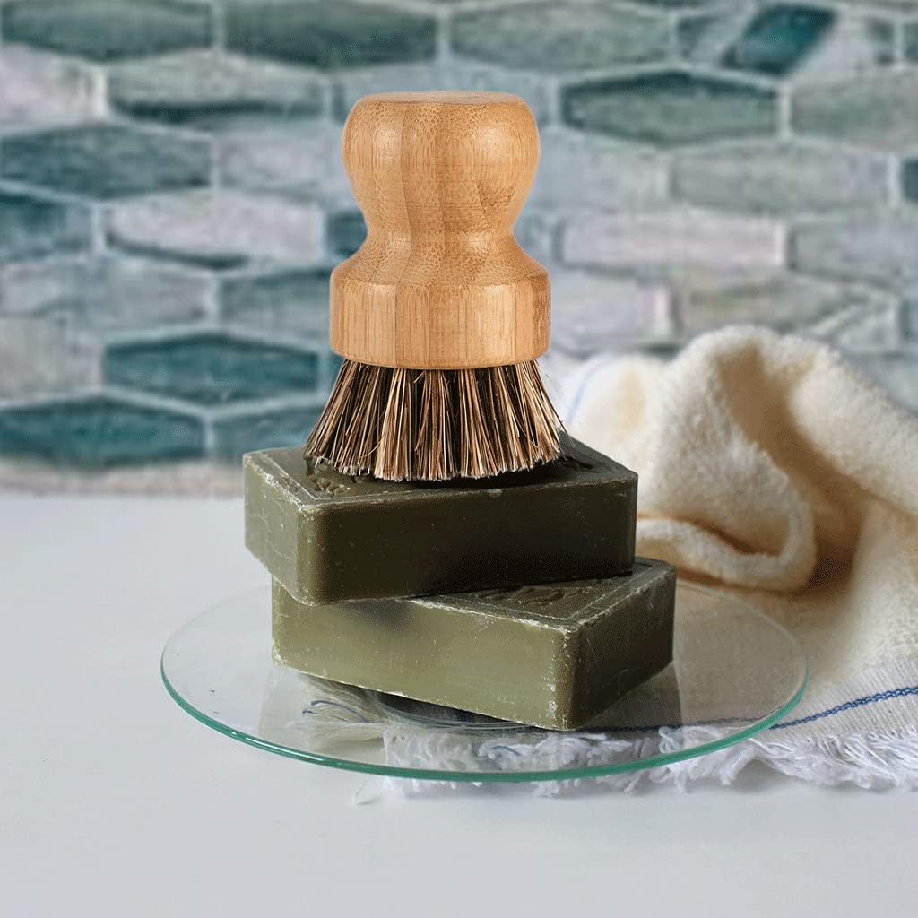 Bamboo Brush Dish Scrubber Clean Pan and Vegetable, Natural Bristles Palm Pot Brush 2 Pack Round Mini Dish Brush with 2 Ceramic Dish for Kitchen Sink Cleaning