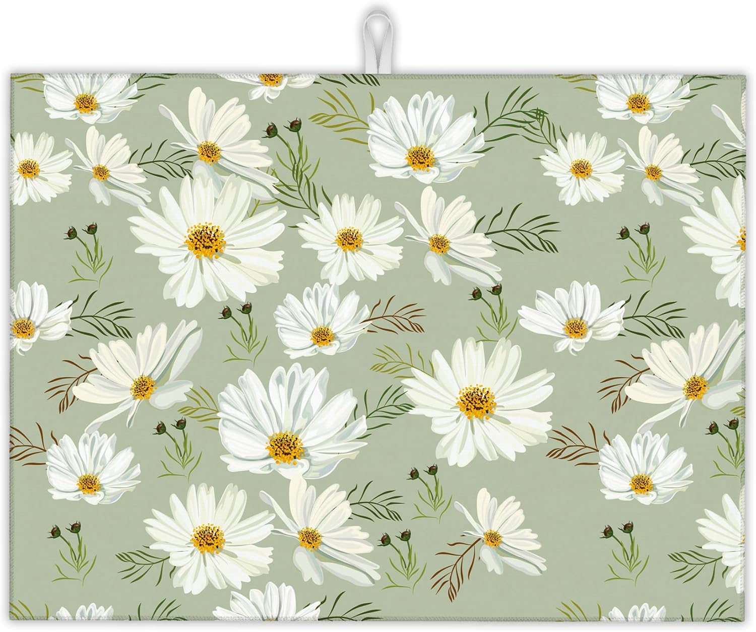 White Daisy Flowers Dish Drying Rack Mat for Kitchen Counter, Dish Drying Pad Absorbent Reversible Microfiber Protector for Coffee Bar Sink Countertops 18x24 Inch