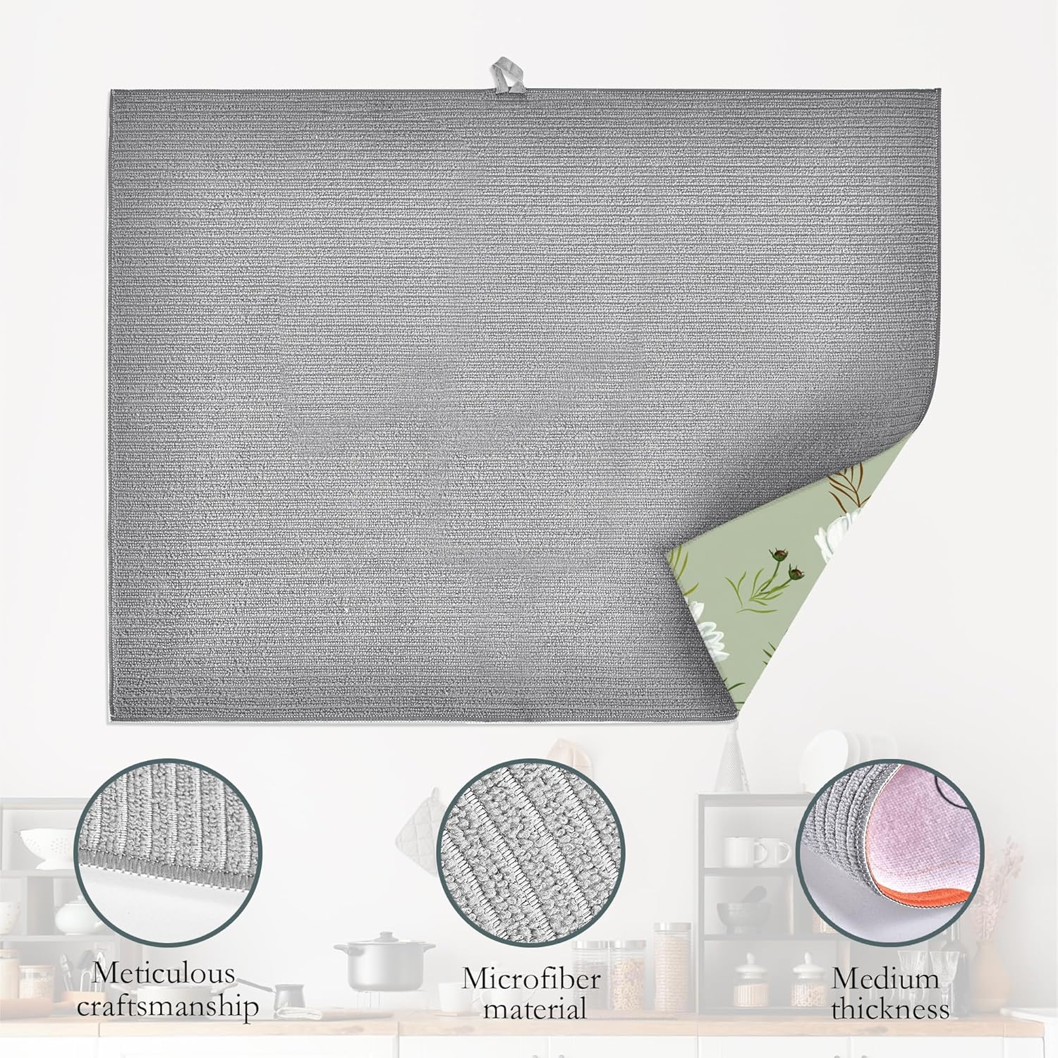 • DESIGN: Reversible with a different design on each side.The dish drying mat with hanging loop, can be hung on the kitchen wall. Soft and foldable, easy to store in any drawer, cabinet, or closet. Microfiber is naturally, long lasting, and cleans up easily, and is effortless to clean.