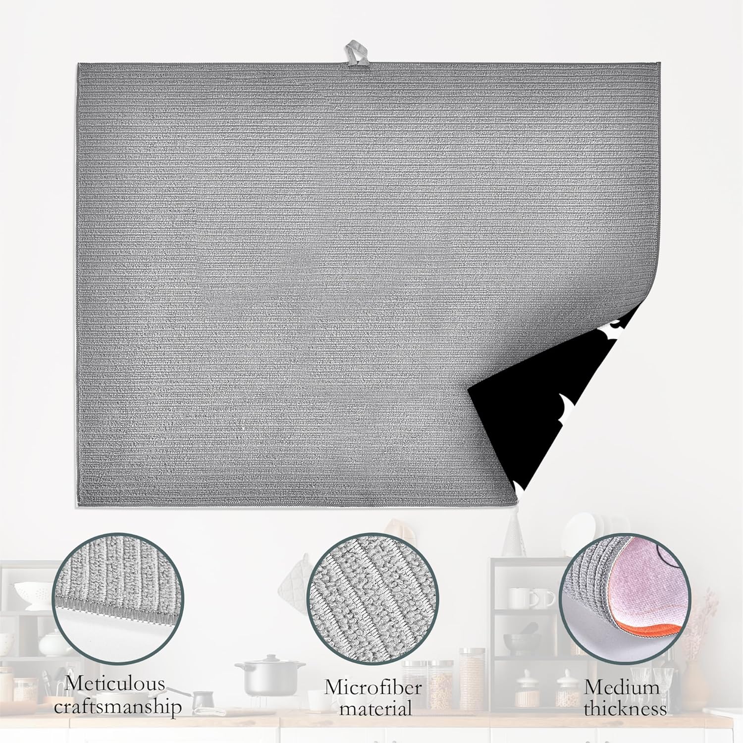 • QUICK DRY: Microfiber terry cloth on the other side absorbs 4X its weight in water, easily keep your counter dry. Our drying mat will suck up all the leftover wetness from your pots, pans, and dishes, and leave the underside both dry. Use alone or pair with a dish drying rack.Offered in rich color options these drying mats are the perfect functional addition to your kitchen decor.
