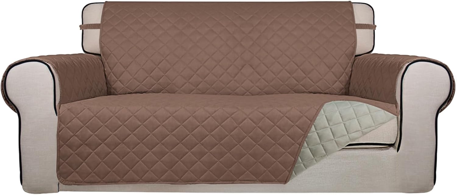 PureFit Reversible Quilted Sofa Cover, Water Resistant Slipcover Furniture Protector, Washable Couch Cover with Non Slip and Elastic Straps for Kids, Dogs, Pets (Oversized Loveseat, Brown/Beige)