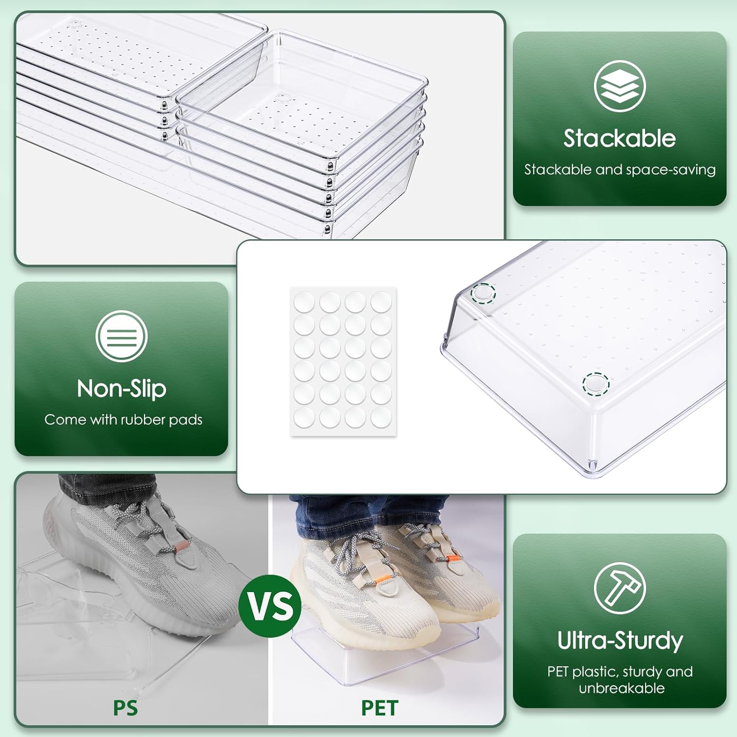 • 【Stackable & Non-Slip Design】Comes with non-slip silicone pads stickers, when the drawer suddenly opens or closes, the silicone pads will hold these organizers firmly in place. When not in use, the boxes can be stacked on top of each other to maximize your storage space.