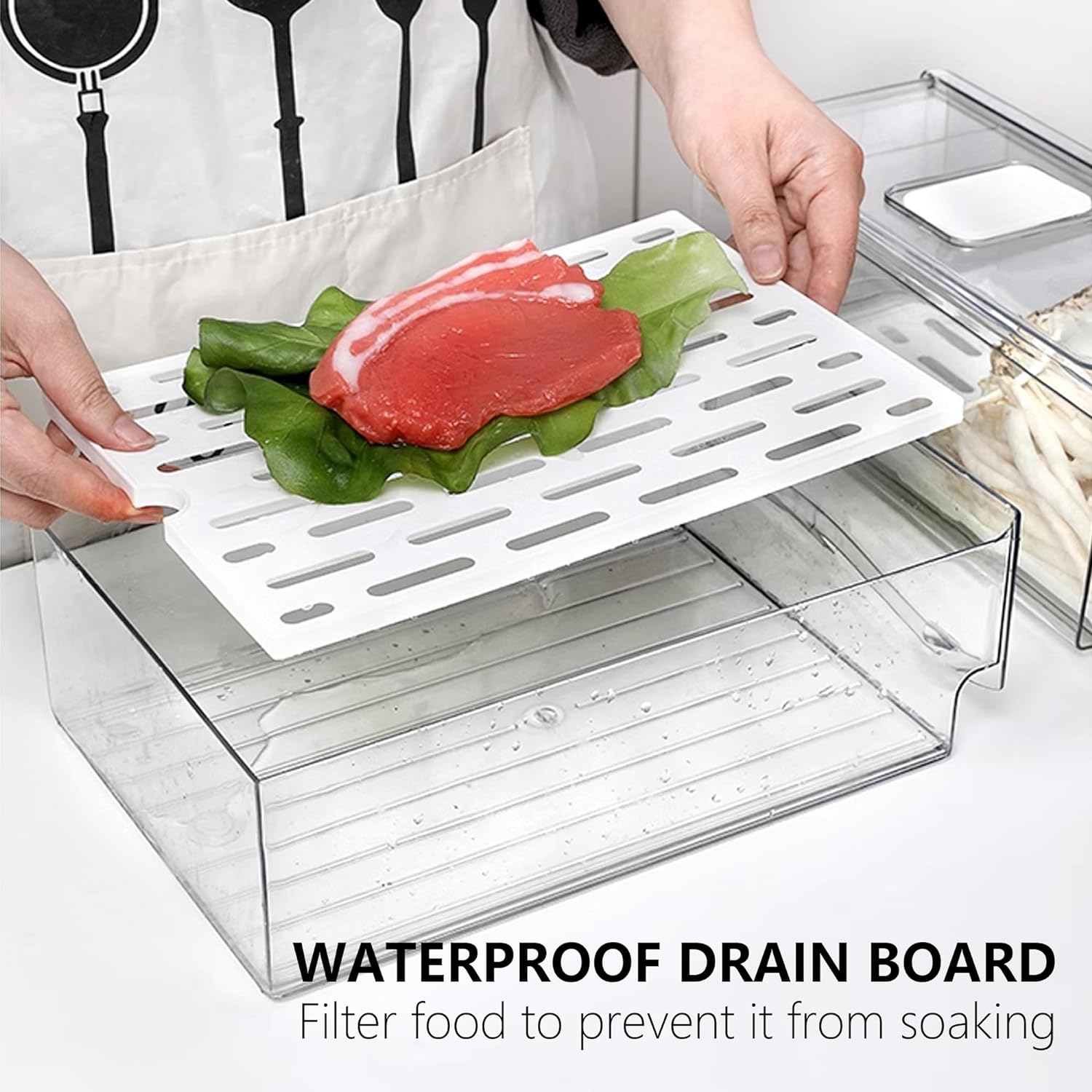 • ใ€๐”๐ฌ๐ž๐Ÿ๐ฎ๐ฅ ๐Š๐ž๐ž๐ฉ ๐…๐จ๐จ๐ ๐…๐ซ๐ž๐ฌ๐กใ€‘Our fridge organizer has a tray and dripping hole design at the bottom. The drain board at the bottom of the refrigerator organizer bins can filter the excess water in the food, prevent the food from soaking in water, and keep the food fresh. S -shaped comfortable handle and rounded corners.The handrail design can help you quickly and easily pull the Fridge containers for fridge out.