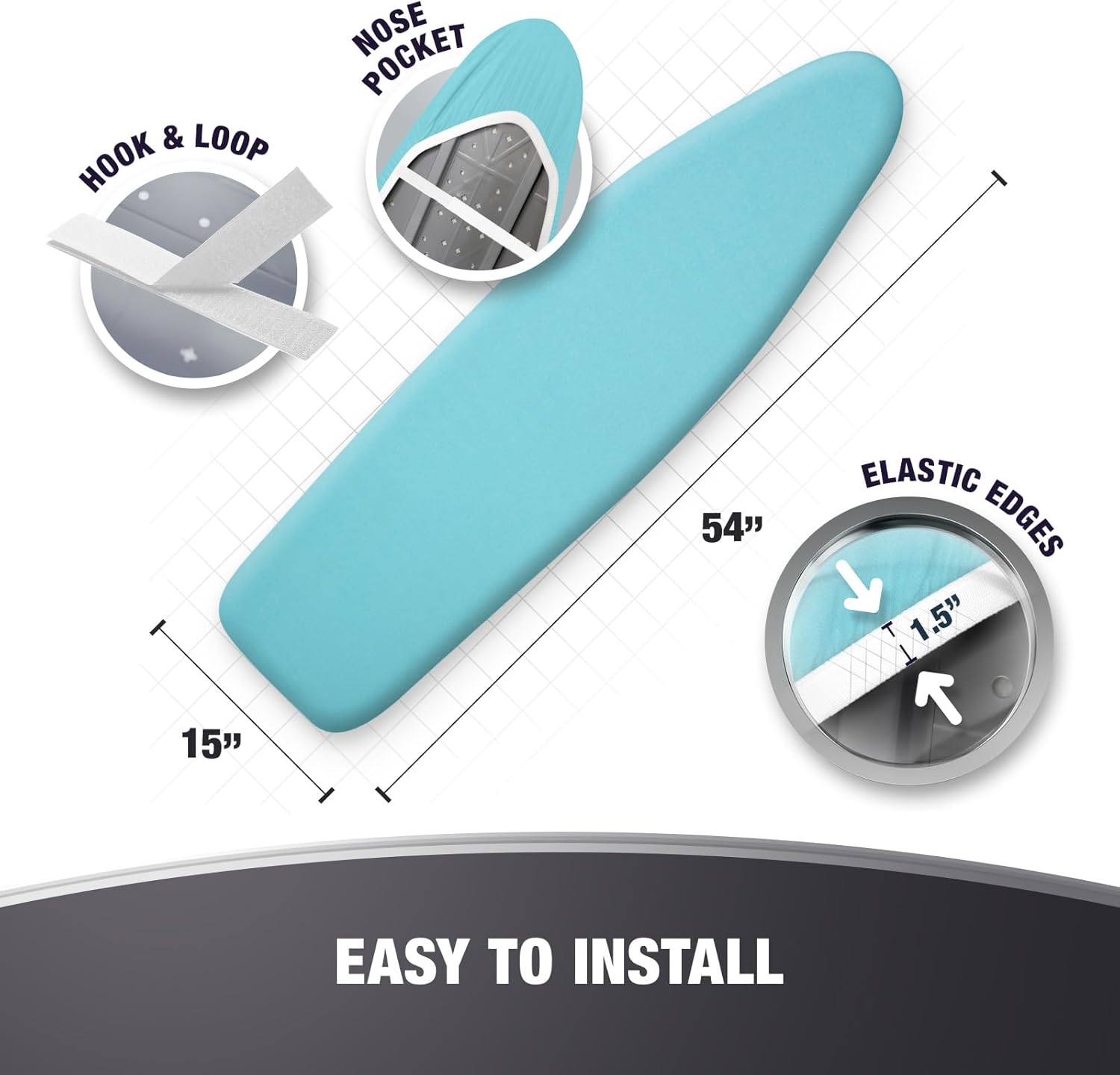 • EASILY FITS STANDARD 15x54 SIZE BOARDS: The ironing board cover can be installed very easily thanks to its durable elastic edges or adjustable drawstring tightening, strong fastener straps and sturdy nose pocket. It is designed for standart size boards in 15x54" dimensions.