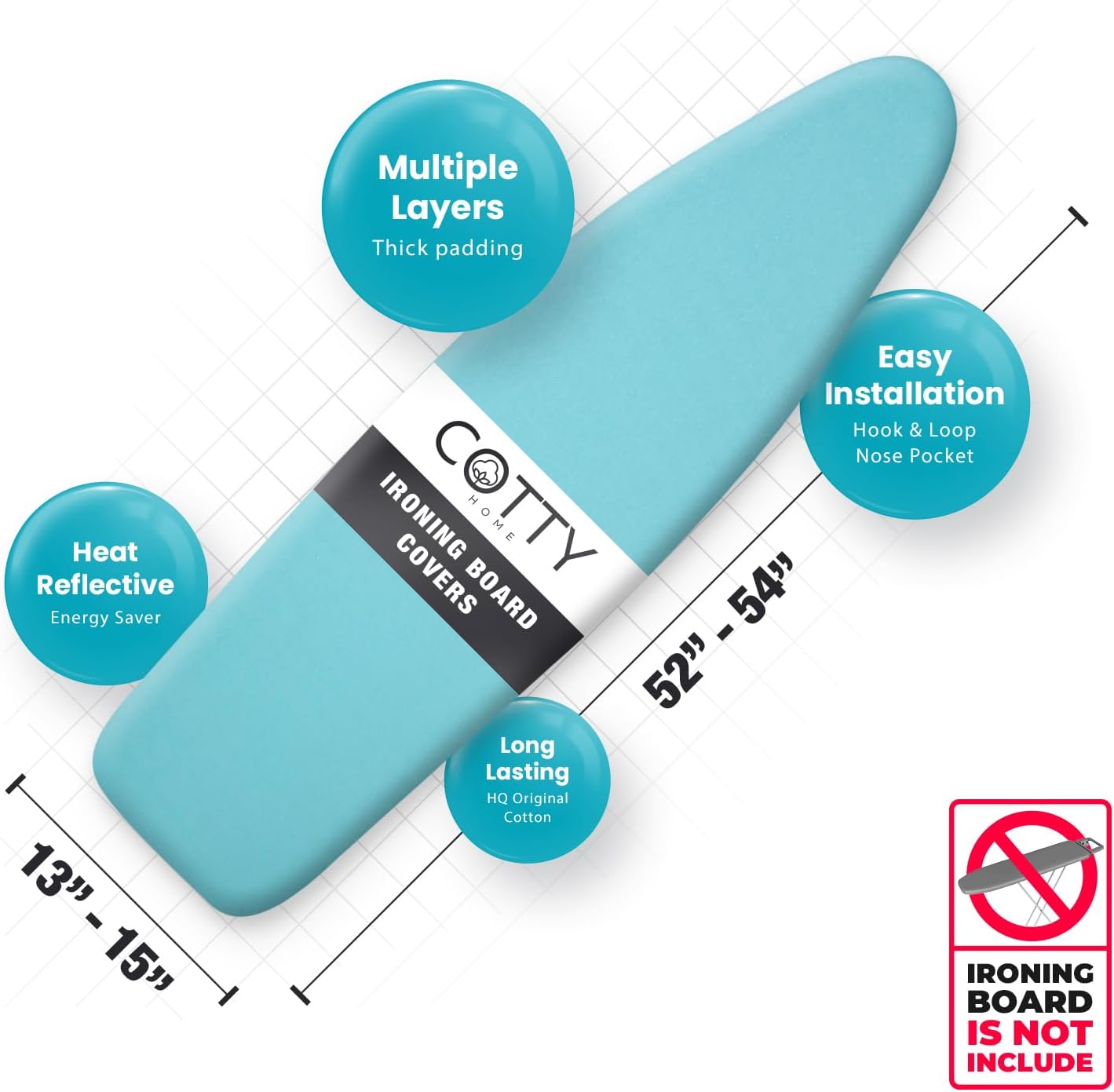 Extra Thick Ironing Board Covers with Pad Standard Size 15x54, Heat Reflective Full Scorch Resistant Padding, Snug Fit Non-Slip Nose Pocket Fastener Straps Elastic Edges, Turquoise