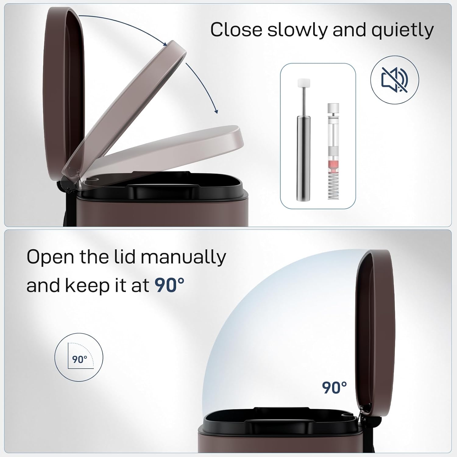 • 【WON'T DISTURB YOU】Using ABS hydraulic deceleration technology, the trash can lid can be slowly and gently closed when the pedal is released, without making a lot of noise, and it will not disturb your family when disposing of garbage.
