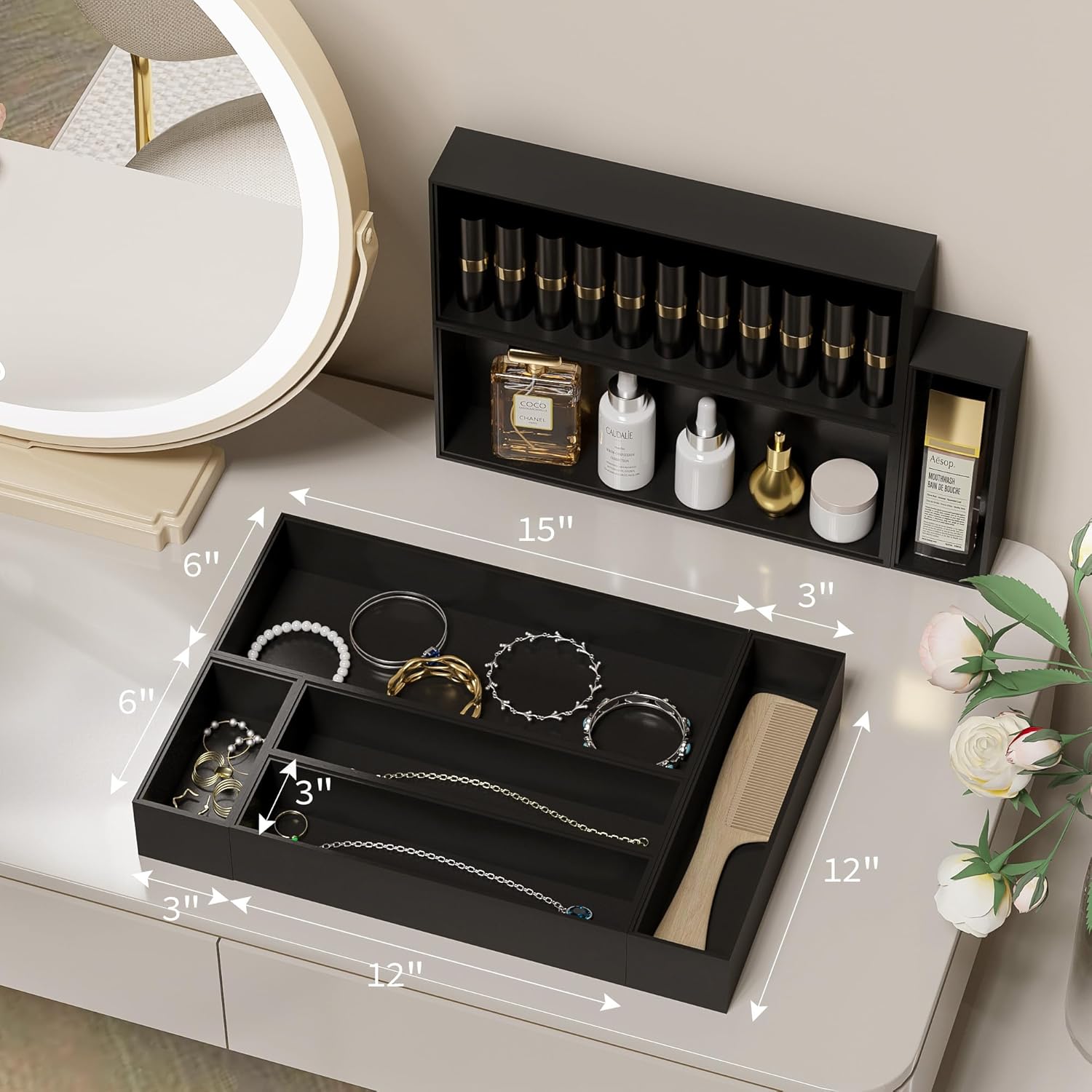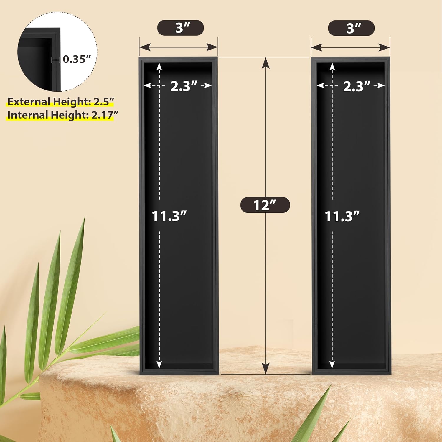 • PLEASE, REFER TO THE SIZE WE LISTED: EXTERNAL SIZE: 12" L x 3" W x 2.5" H; INTERNAL SIZE: 11.3" L x 2.3" W x 2.17" H, AND MEASURE YOUR DRAWER OR ITEMS FIRST