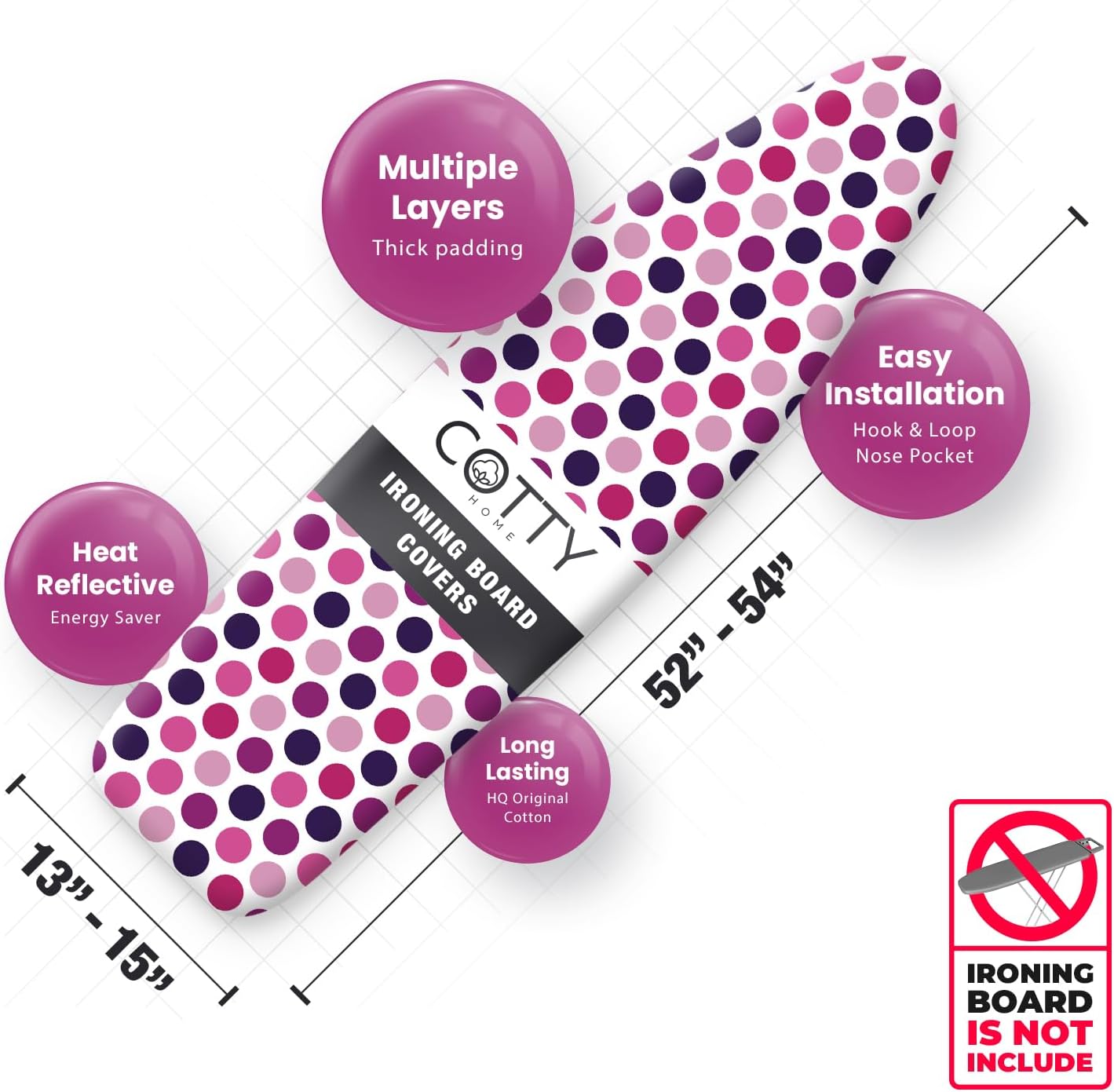 Extra Thick Ironing Board Covers with Pad Standard Size 15x54, Heat Reflective Full Scorch Resistant Padding, Snug Fit Non-Slip Nose Pocket Fastener Straps Elastic Edges, Polka Dots