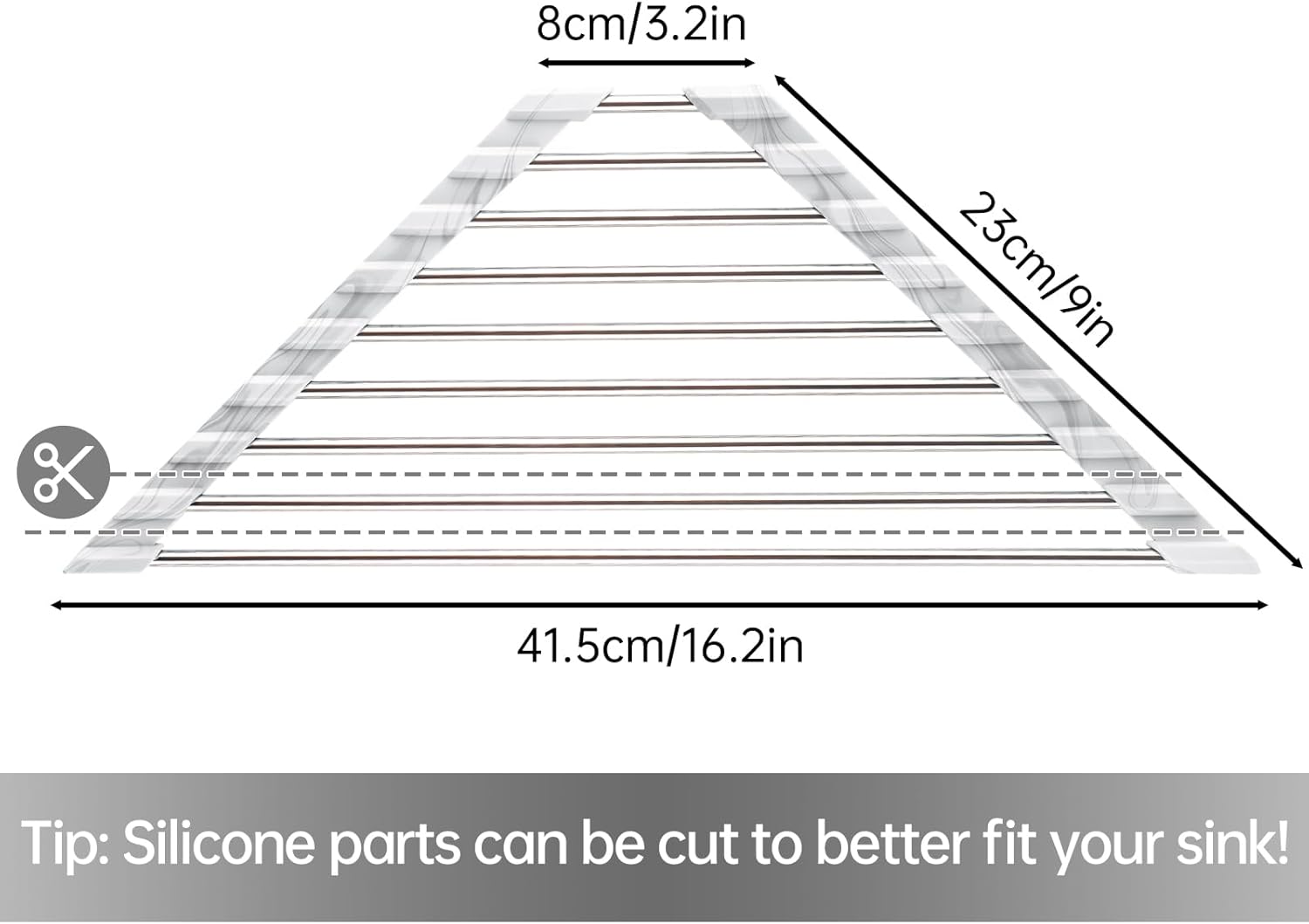 • ✔️【Small Over Sink Drying Rack】A handy tool that allows you to easily rinse and dry small items to keep your kitchen clean and organized. The triangle shape makes full use of your kitchen sink corner space and is designed for maximum stacking ability to efficiently dry dishes with proper drainage and ventilation. Top Length: 3.2”, Bottom Length: 16.2”, Side Length: 9”. Color: Marble.