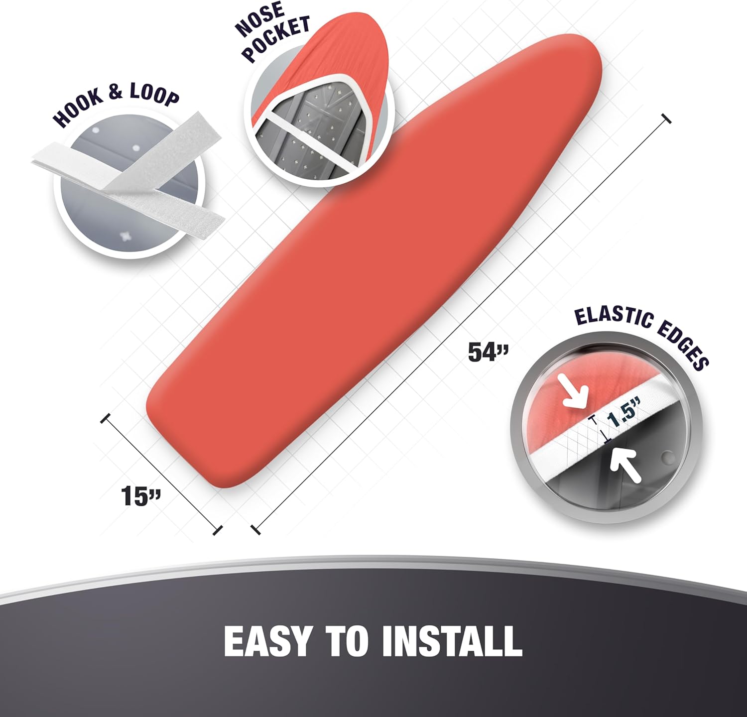 • EASILY FITS STANDARD 15x54 SIZE BOARDS: The ironing board cover can be installed very easily thanks to its durable elastic edges or adjustable drawstring tightening, strong fastener straps and sturdy nose pocket. It is designed for standart size boards in 15x54" dimensions.