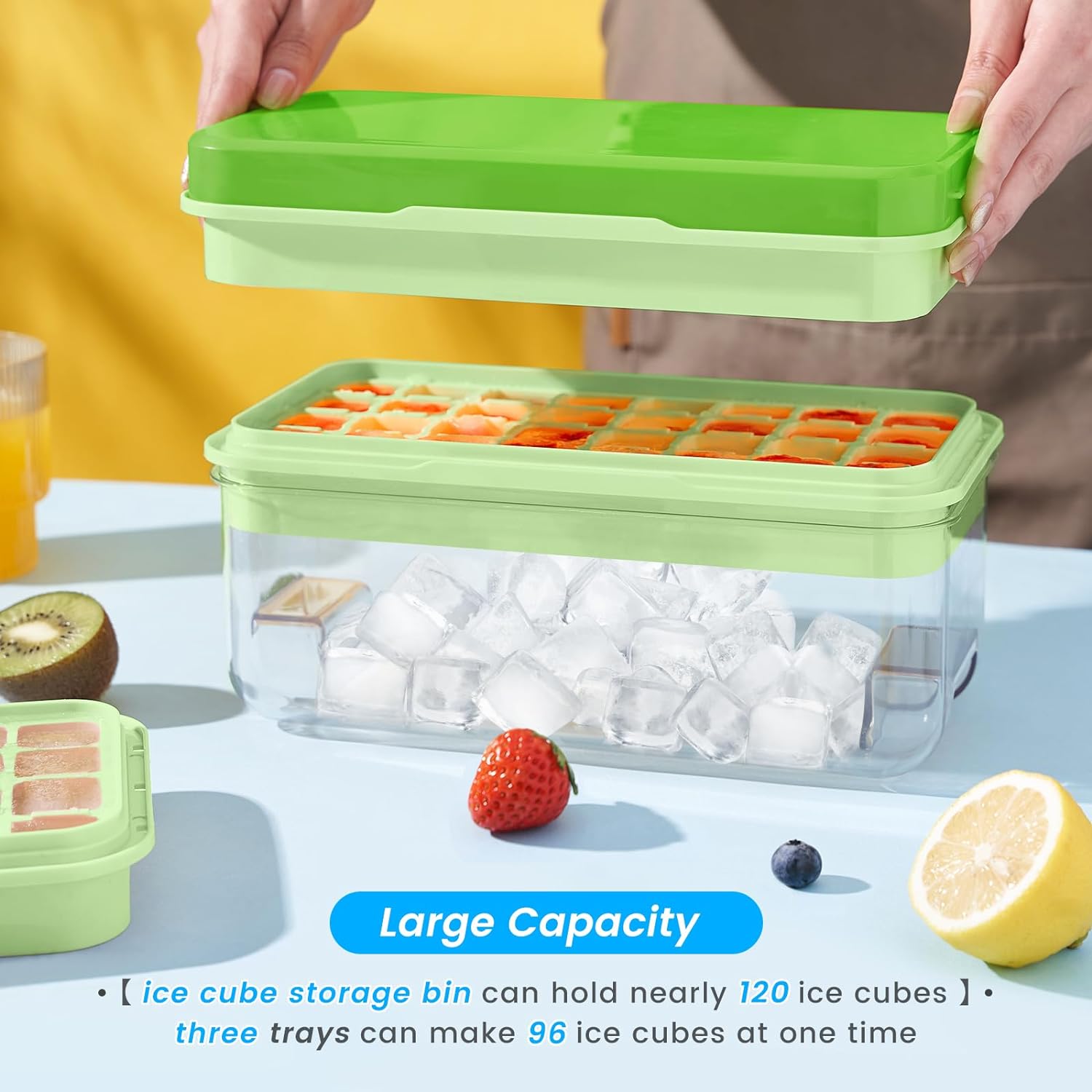 PHINOX Ice Cube Tray with Lid and Bin, 3 Pack Plastic Ice Cube Tray Molds, 96(4 * 8 * 3) pcs Ice Trays for freezer, Chilling Drinks, Whiskey & Cocktails, with Ice Container and Ice Scoop, BPA-Free