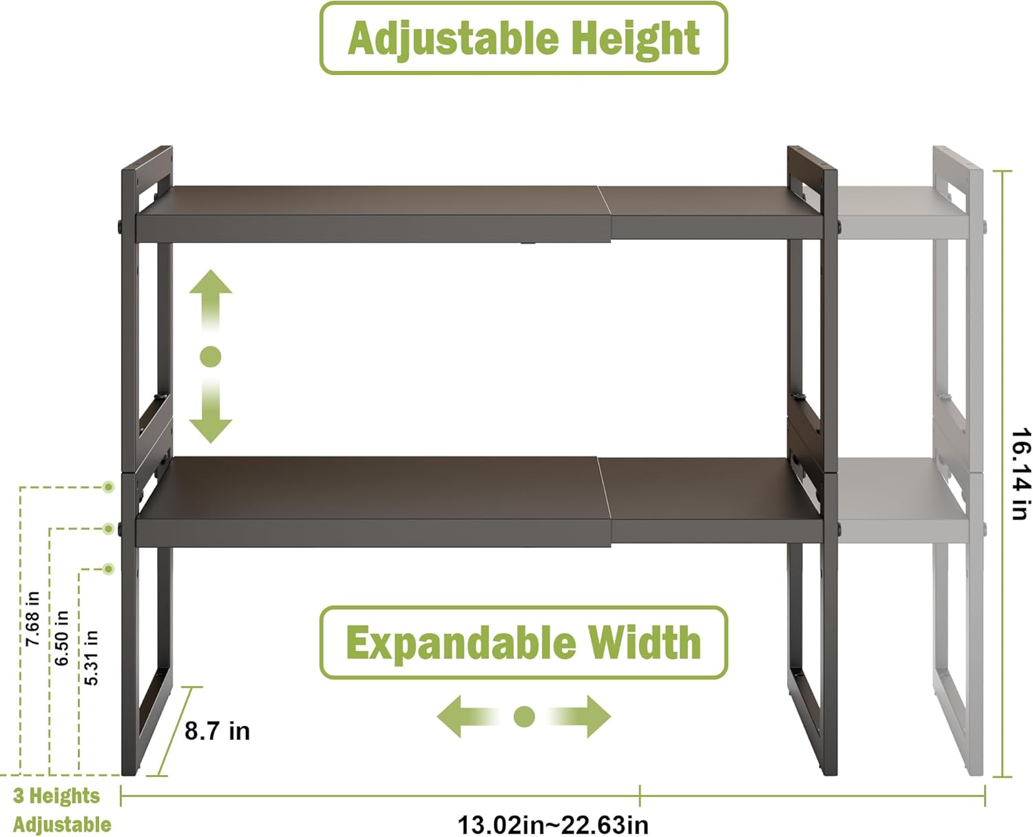• 【Expandable & Stackable Cabinet Organizer】The length and height of this shelf can be adjusted, The length of expandable shelf can be adjusted from 13 to 23 Inches according to the different space; The Height can be adjusted from 5.1 inches to 7.5 Inches depending on how you want to arrange your space.