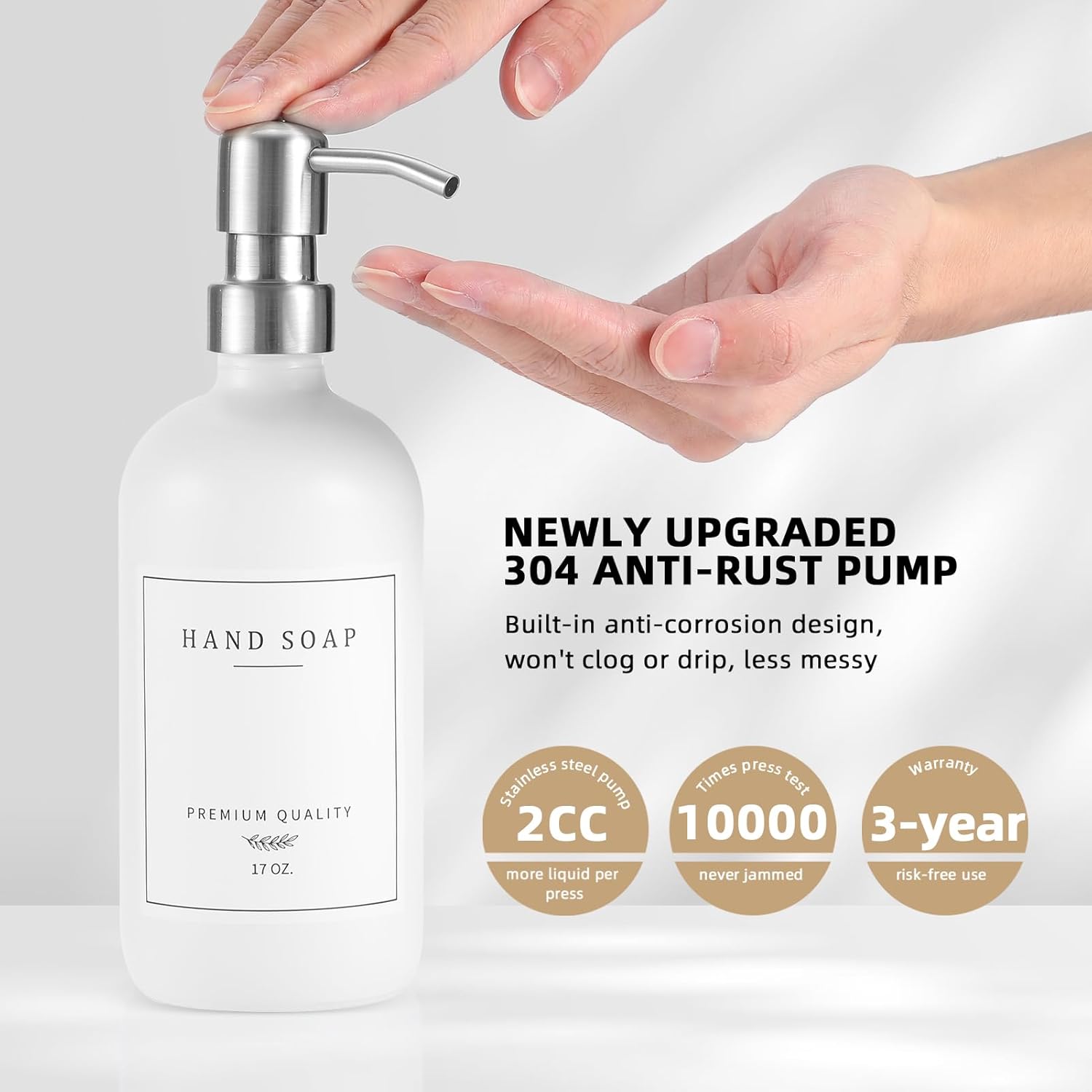 • A practical and aesthetically pleasing addition to your home: This soap dispenser set contains 2 reinforced hard glass bottles with sleek and stylish stainless steel pump heads for your liquid soap; hand soap, dish soap, hand lotion, body wash, shampoo, conditioner labels, 1 silicone funnel, 1 waterproof non-slip tray, this set has transformed mundane routines into moments of indulgence and style.