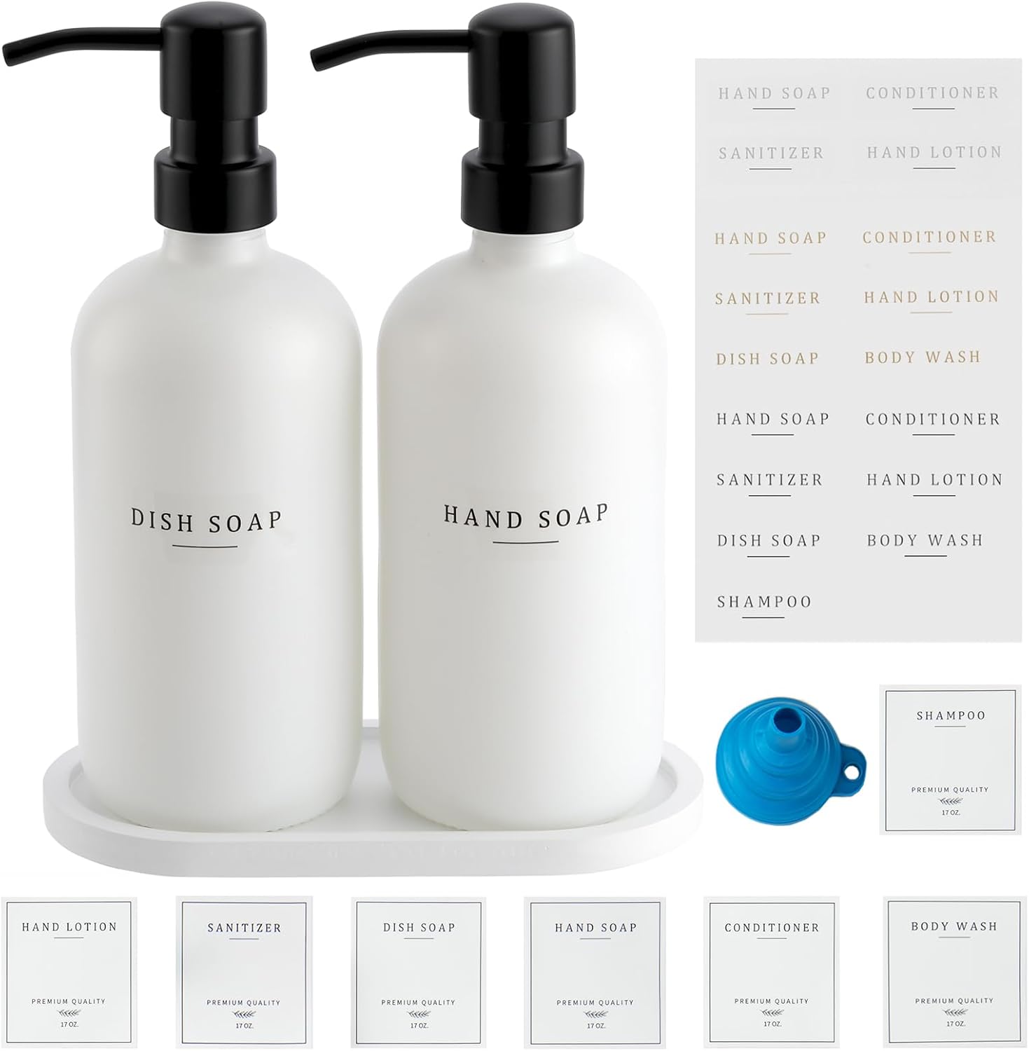 • A practical and aesthetically pleasing addition to your home: This soap dispenser set contains 2 reinforced hard glass bottles with sleek and stylish stainless steel pump heads for your liquid soap; hand soap, dish soap, hand lotion, body wash, shampoo, conditioner labels, 1 silicone funnel, 1 waterproof non-slip tray, this set has transformed mundane routines into moments of indulgence and style.