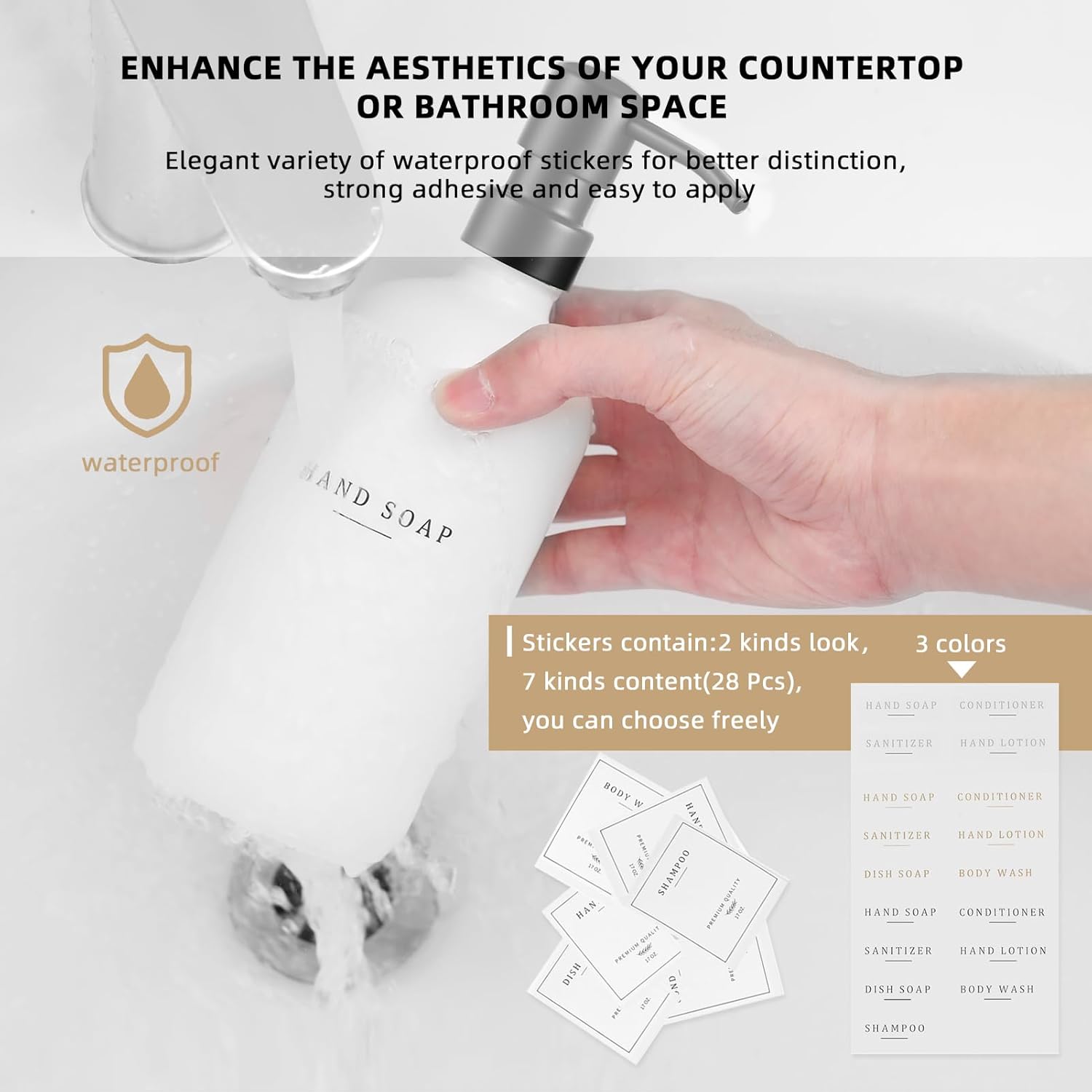 • Elevating your kitchen and bathroom experience:This dish soap dispenser for kitchen with minimalist modern farmhouse chic style waterproof sticker,21pcs,pretty versatile customize the labels to your taste, can also change the labels out if you decide to change the look/colors match your decor. Waterproof material don't peel even when it gets wet and moist every day, perfect for the modern farmhouse vibe or really any kitchen decor.