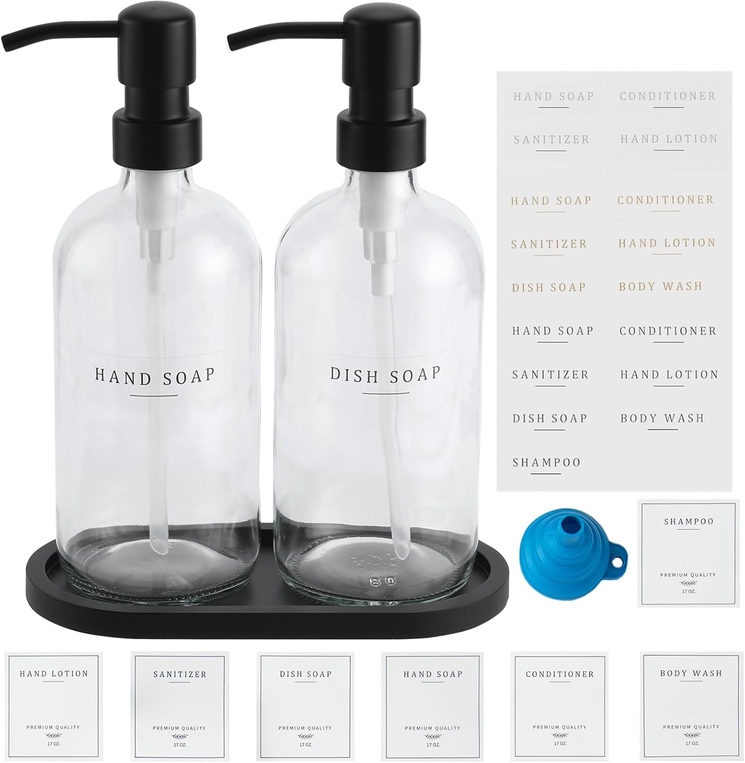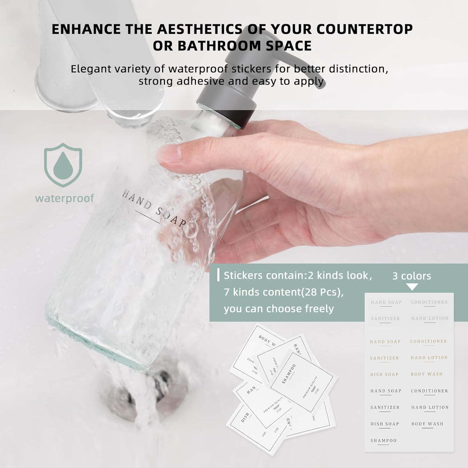 • A practical and aesthetically pleasing addition to your home: This soap dispenser set contains 2 reinforced hard glass bottles with sleek and stylish stainless steel pump heads for your liquid soap; hand soap, dish soap, hand lotion, body wash, shampoo, conditioner labels, 1 silicone funnel, 1 waterproof non-slip tray, this set has transformed mundane routines into moments of indulgence and style.