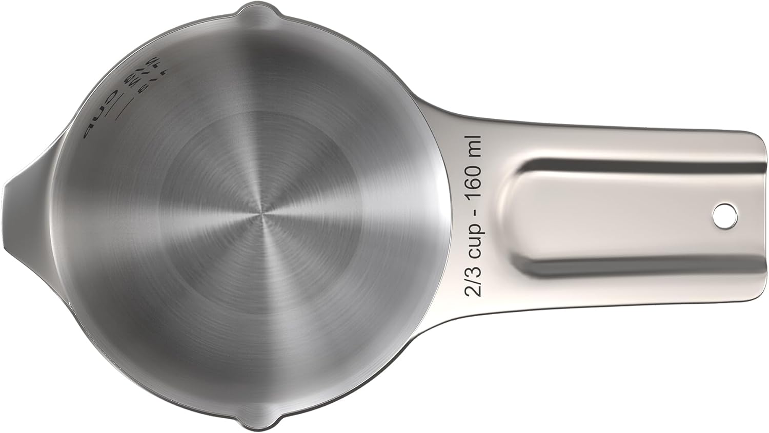 • Accurate ⅔ Cup Measuring Cup (Chrome Finish) with Embossed Markings – Clearly embossed with ⅔‑cup (⅔ taza), ½‑cup (½ taza), ⅓‑cup (⅓ taza), and 160 ml graduations. Dual US and metric markings deliver lasting accuracy that won’t fade or scratch away.