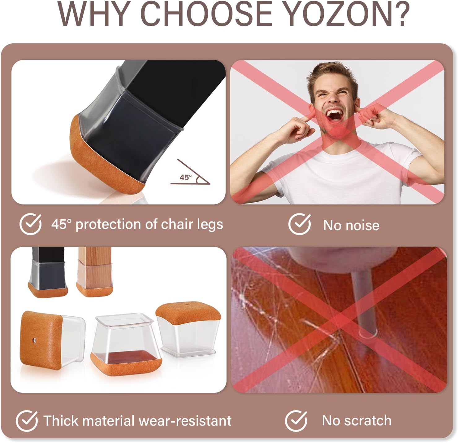 • [Reinforced bottom felt pad]-These chair leg protectors are designed for angled chair legs. The upgraded cup-shaped felt pad grips the chair legs securely. Even when the chair is tilted, it stays stable while protecting your floors from scratches and noise.