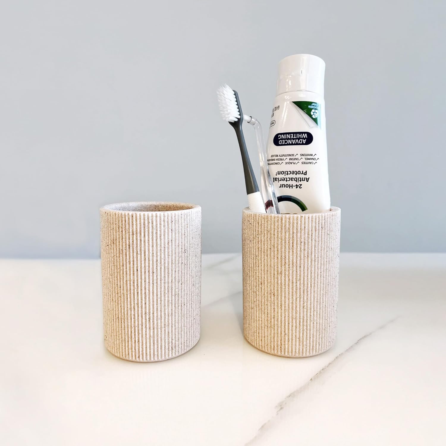 • GREAT DURABILITY: The beige bathroom tumbler cup is made of sturdy material that is much more durable than glass or ceramic. Our toothbrush holder is rust-proof and water-proof.