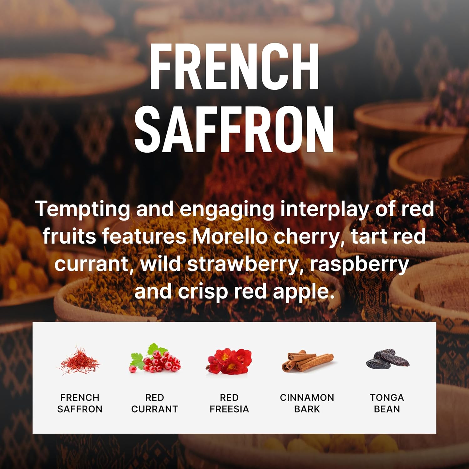 • French Saffron: A tempting and engaging interplay of red fruits featuring morello cherry, tart red currant, wild strawberry, raspberry and crisp red apple. Sensuality evolves with caresses of creamy caramel, amber, vetiver and cedar to which notes of intrigue and mystery are revealed in the French saffron, oakmoss, guaiacwood, cashmeran and tonka bean.