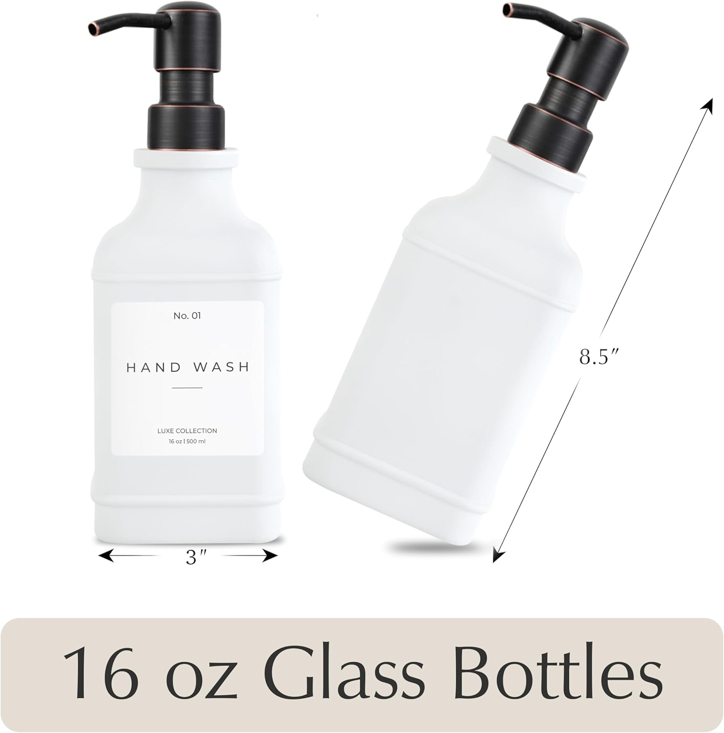 • ✅ PREMIUM QUALITY THAT LASTS: Designed to complement any space, these 16 oz glass soap dispensers are perfect for hand soap, dish soap, lotion, or shampoo. Ideal for sinks in your kitchen, bathroom, laundry room, or guest bath. Unlike dispensers that peel or break down, our bottles are made from thick, durable glass that resists wear and looks elegant on any countertop.