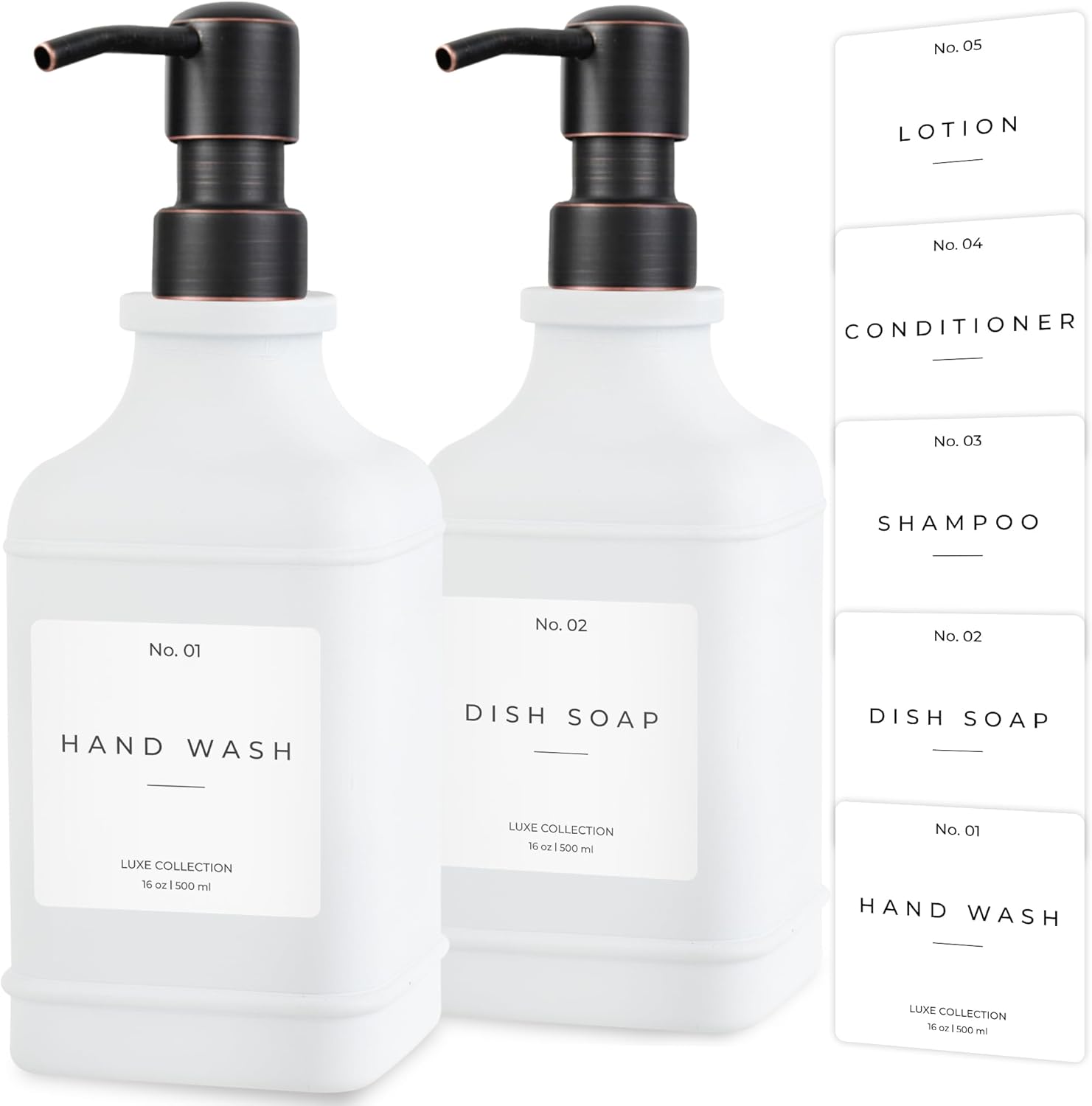 • ✅ 5 WATERPROOF LABELS: Now with 5 stickers, it's your choice to use the Kitchen Soap Dispenser Set with Dish Soap for hand soap, dish wash, lotion, conditioner, or shampoo. To clean the lotion dispenser set for the bathroom and kitchen sink soap dispenser set, just run the bottle under water and watch any residue simply wash off. With our exclusive no-leak pump, the bottle enables you to put out a good amount of soap with a single pump.