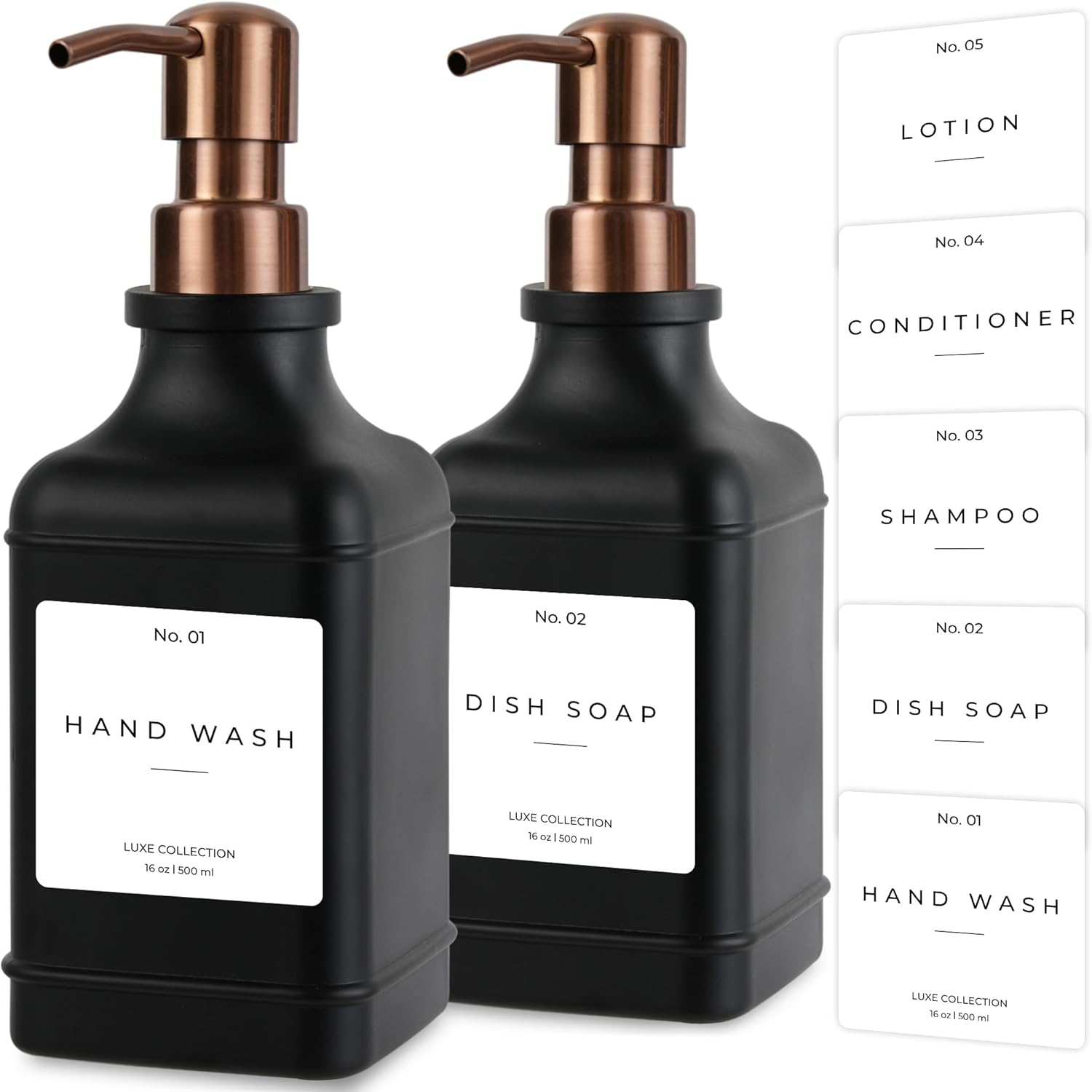 • ✅ 5 WATERPROOF LABELS: Now with 5 stickers, it's your choice to use the Kitchen Soap Dispenser Set with Dish Soap for hand soap, dish wash, lotion, conditioner, or shampoo. To clean the lotion dispenser set for the bathroom and kitchen sink soap dispenser set, just run the bottle under water and watch any residue simply wash off. With our exclusive no-leak pump, the bottle enables you to put out a good amount of soap with a single pump.