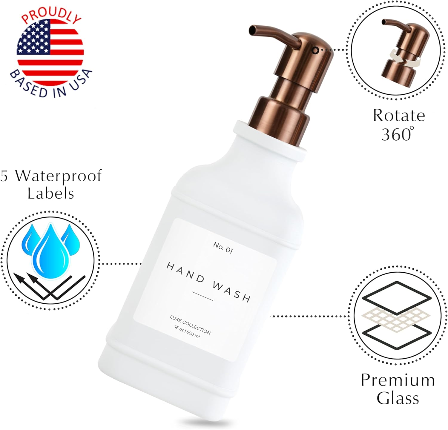 • ✅ PREMIUM QUALITY THAT LASTS: Designed to complement any space, these 16 oz glass soap dispensers are perfect for hand soap, dish soap, lotion, or shampoo. Ideal for sinks in your kitchen, bathroom, laundry room, or guest bath. Unlike dispensers that peel or break down, our bottles are made from thick, durable glass that resists wear and looks elegant on any countertop.