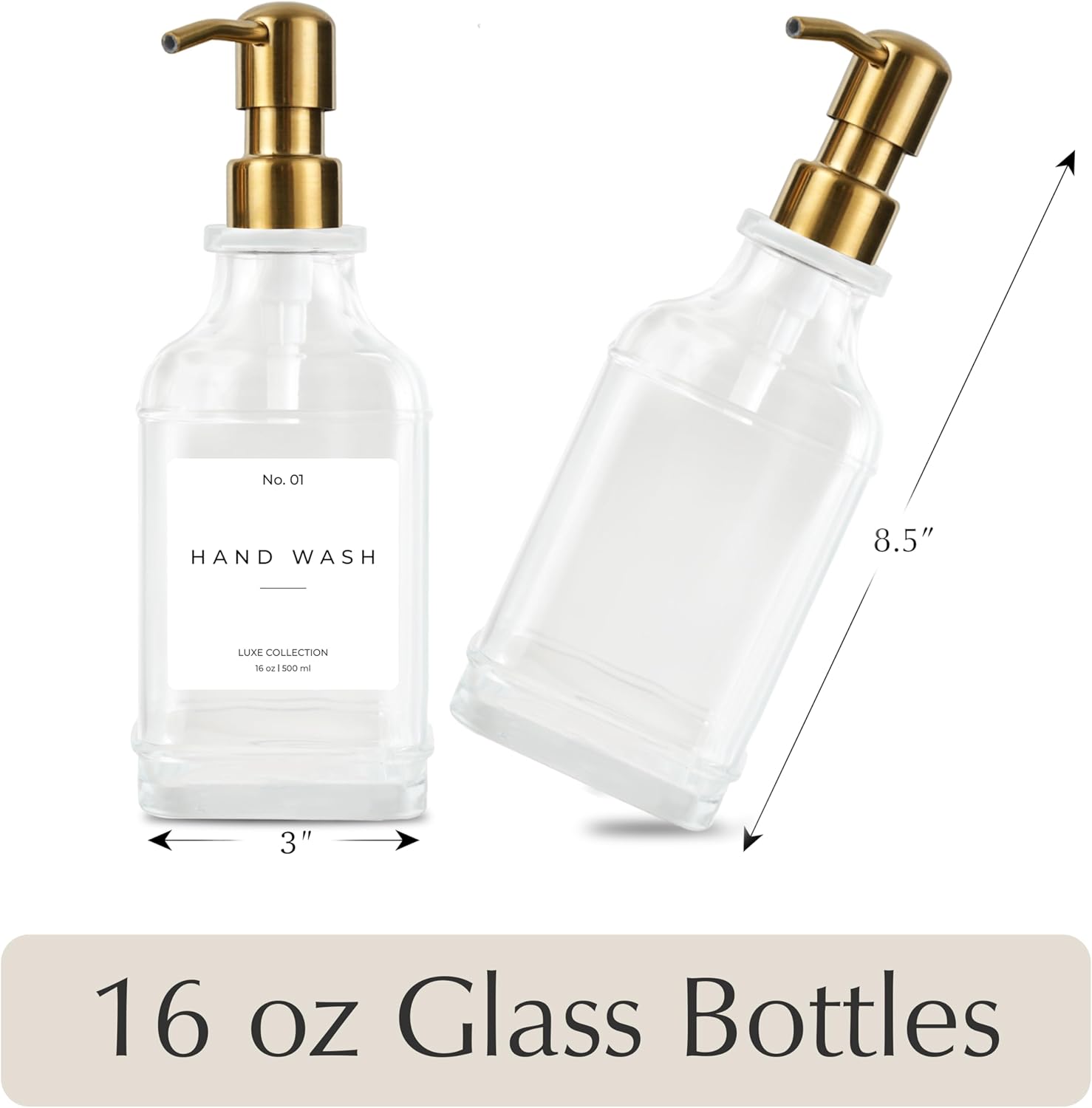 Emerson Essentials Soap Dispenser, Dish Soap Dispenser, Soap Dispenser Bathroom Set, Hand Soap Dispenser, Kitchen Soap Dispenser Set, Glass Soap Dispenser with Pump and Labels | 16 Oz, 2-Pack