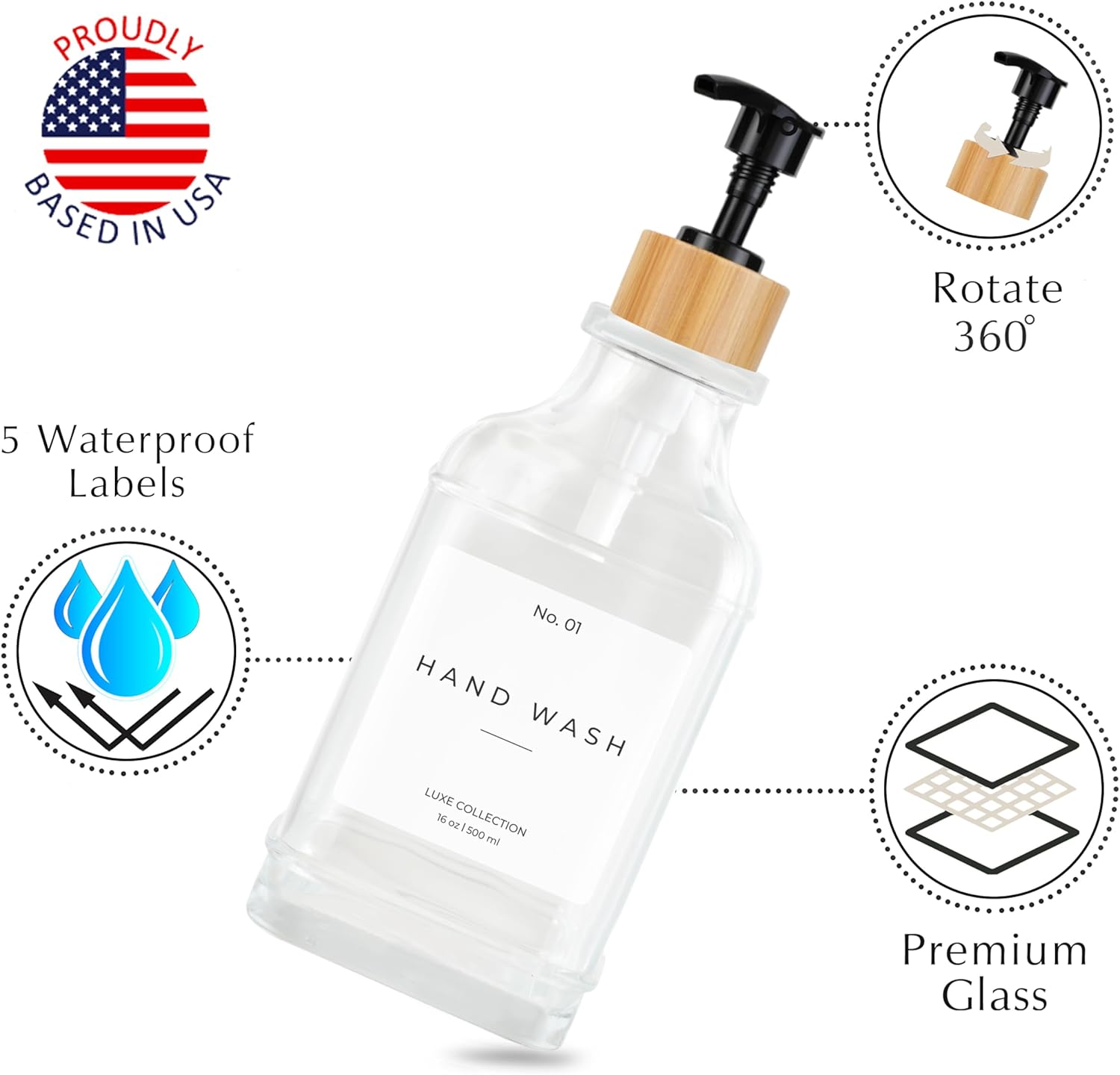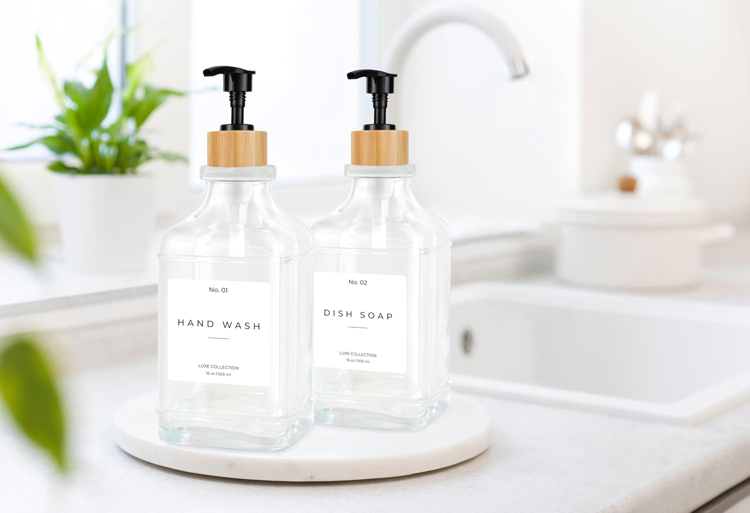• ✅ PREMIUM QUALITY THAT LASTS: Designed to complement any space, these 16 oz glass soap dispensers are perfect for hand soap, dish soap, lotion, or shampoo. Ideal for sinks in your kitchen, bathroom, laundry room, or guest bath. Unlike dispensers that peel or break down, our bottles are made from thick, durable glass that resists wear and looks elegant on any countertop.