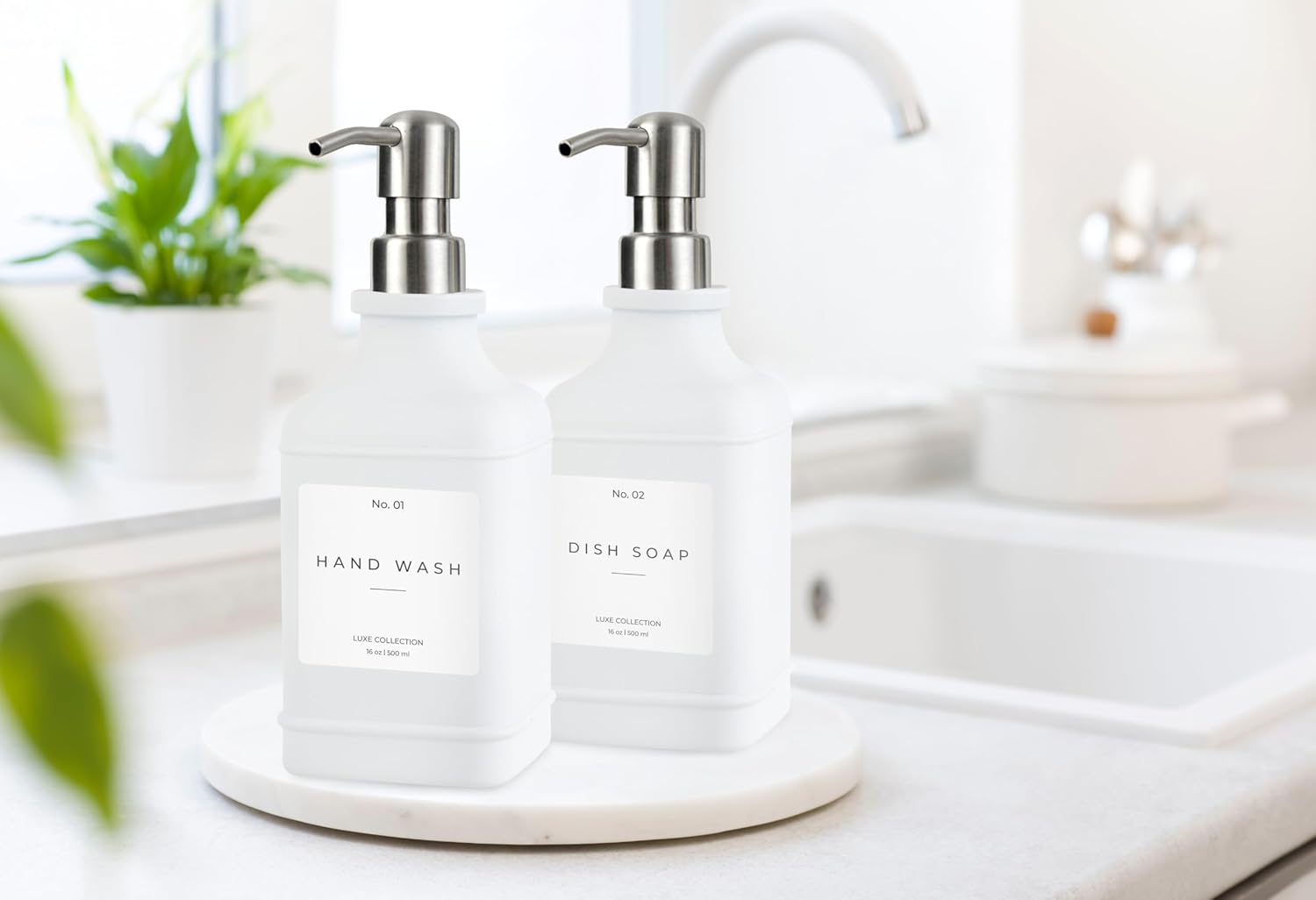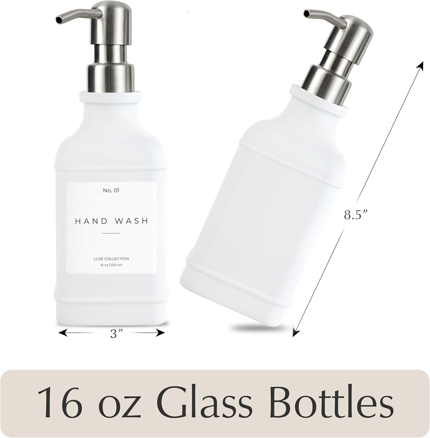 • ✅ 2 PACK: While other dispensers peel over time, our dispensers are made of premium quality and last far longer. The bathroom soap dispensers and kitchen soap dispenser set are 16 ounces and are refillable, requiring fewer refills. Ideal for using as a bathroom soap dispenser set and the glass soap dispenser with pumps boast 2 cc stainless steel pumps.