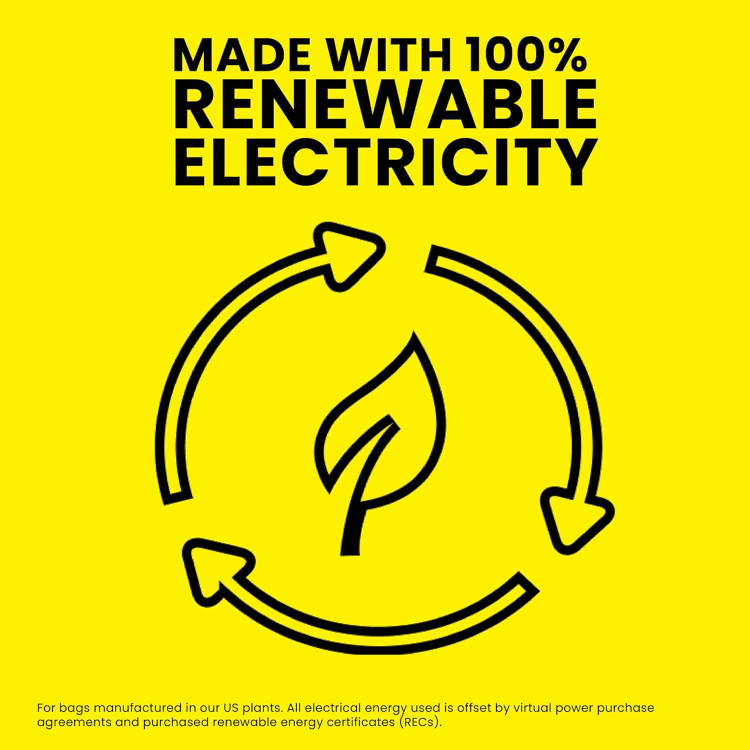 • MADE WITH 100% RENEWABLE ELECTRICITY*: For bags manufactured in our US plants, all electrical energy used is offset by virtual power purchase agreements and purchased renewable energy certificates