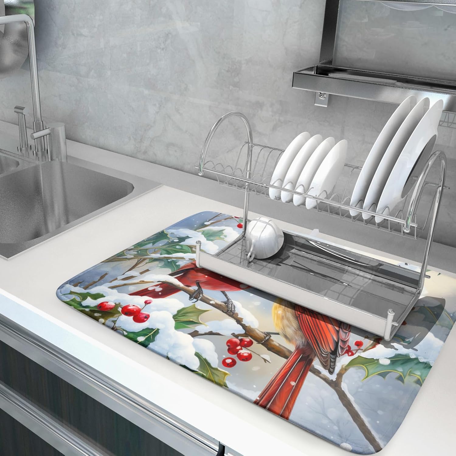 Winter Cardinal Birds Dish Drying Mat, Holly Berry Branches Dish Drying Mat for Kitchen Counter, Red Birds Absorbent Fast Dry Dish Drainer Mat Protector Xmas Microfiber Dish Drying Pad 16x18 Inch