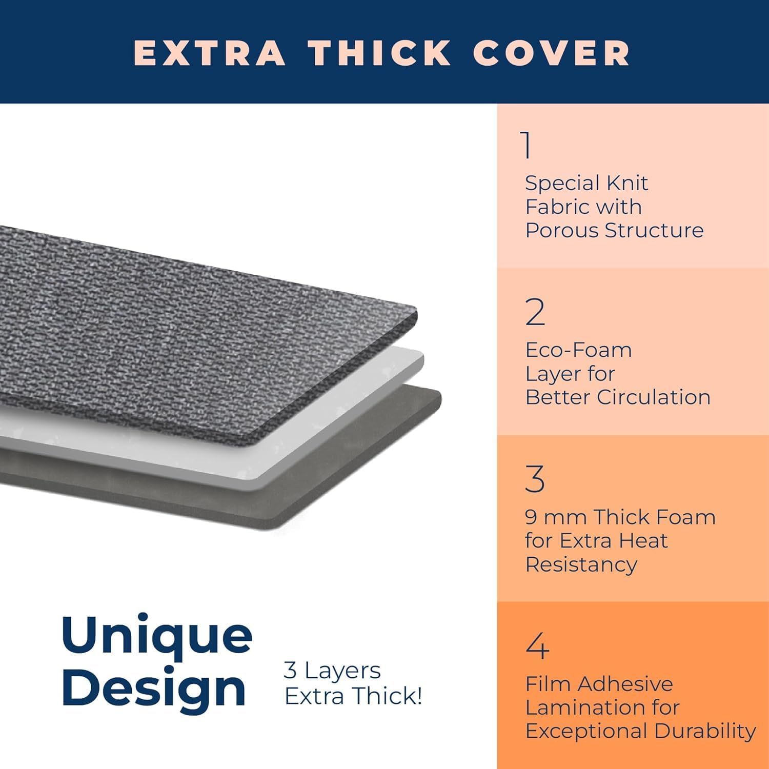 • EXTRA THICK PADDING FOR REMARKABLE DURABILITY: Heavy-duty padding (9 mm thick felt) and meticulously crafted special knitted fabric provides exceptional durability to ironing board cover. Top layer is extremely soft and heat resistant.Happhom cover is specially designed to meet a contemporary taste. Our cover with exclusive patterns and design is a great fit to family d‚cor.