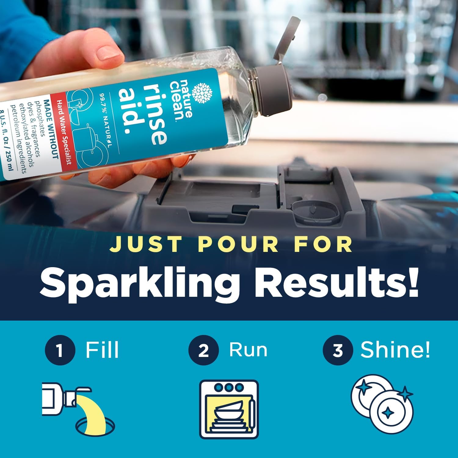 Nature Clean All Natural Dishwasher Rinse Aid Cleaner, Liquid Dishwasher Rinse Agent for Spot-Free Glass & Cutlery in Hard Water, Non Toxic Dish Washer Rinse Aid & Stain Remover, 8 oz/250ml, Pack of 6
