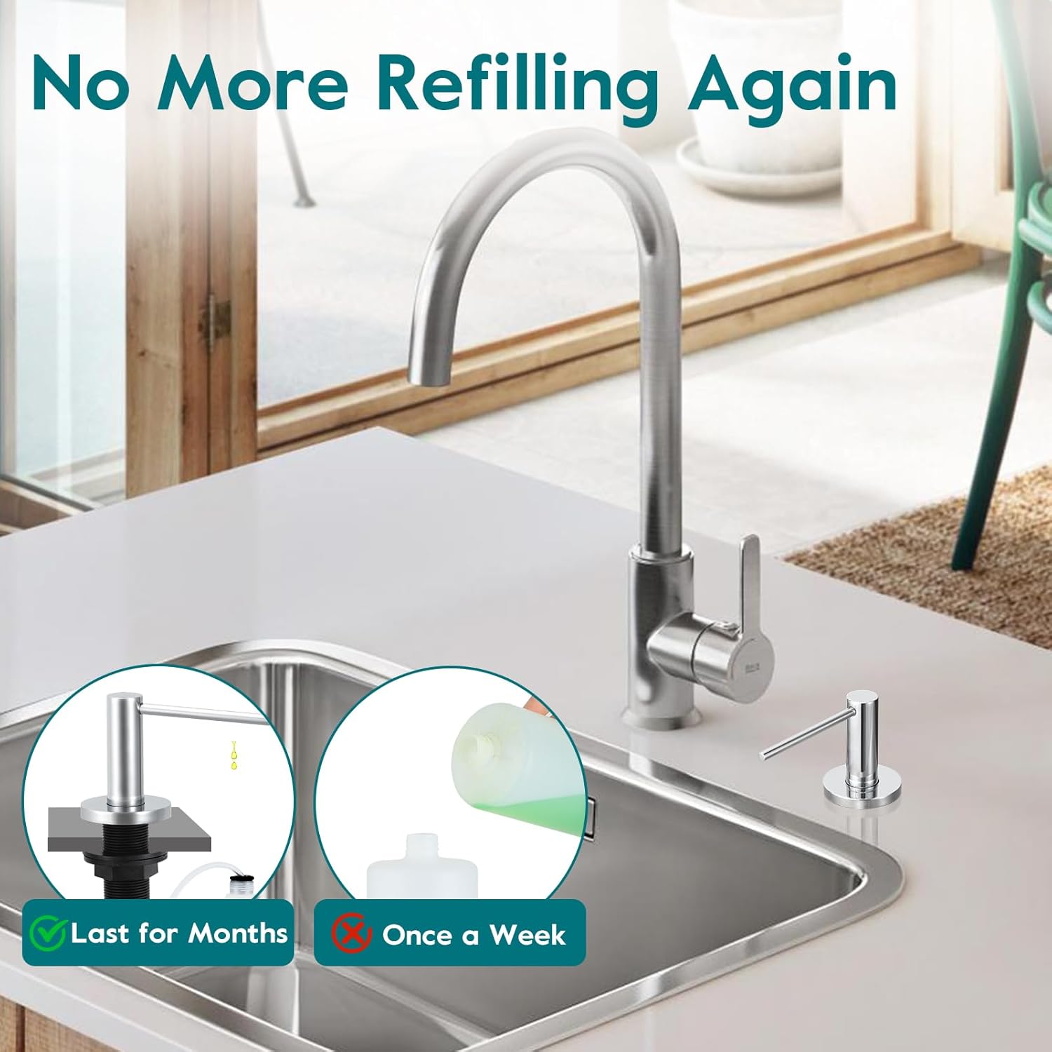 • Material: Our soap dispenser for kitchen sink is made of commercial grade 304 stainless steel, its finish makes it resistant to corrosion and rust