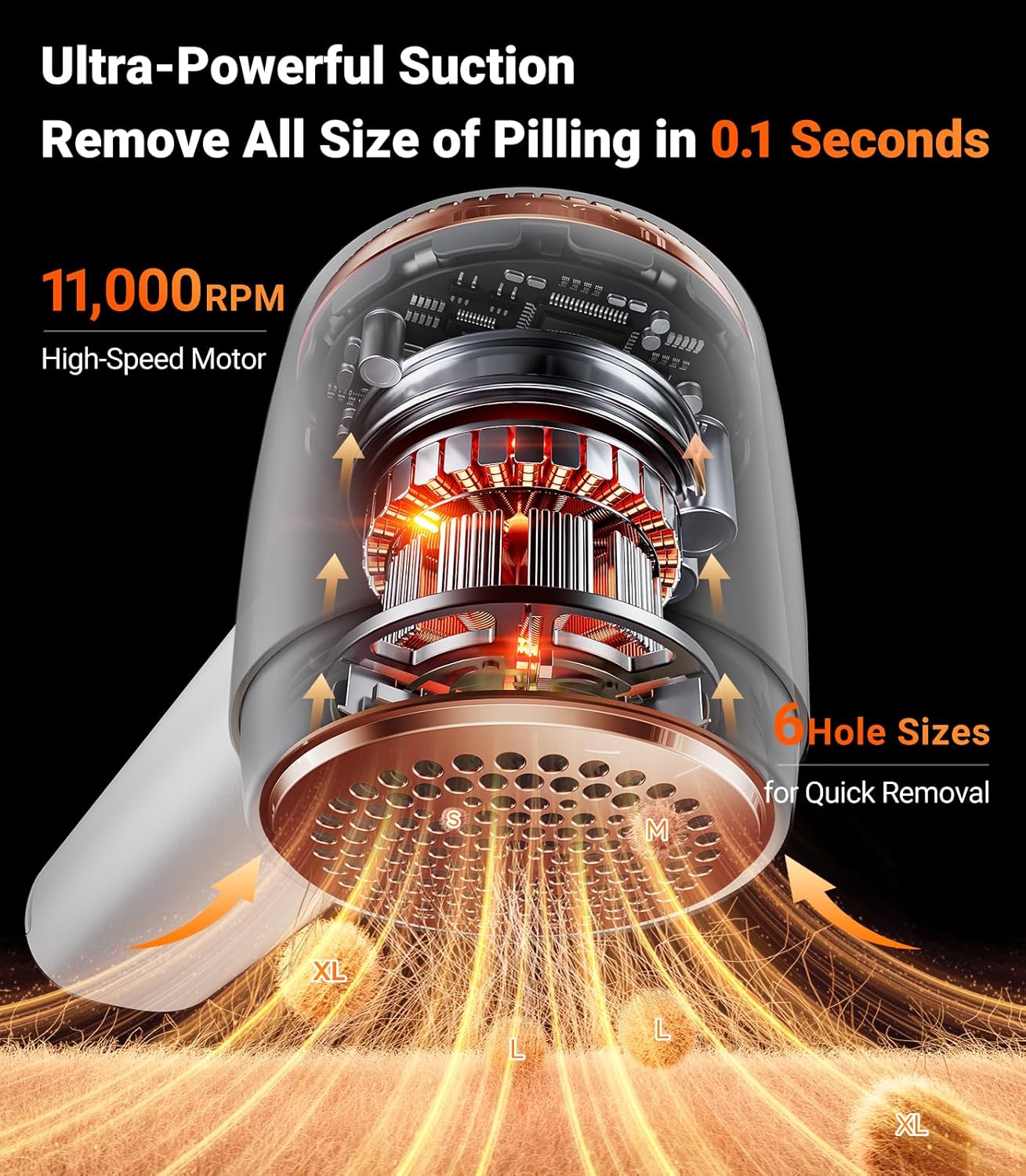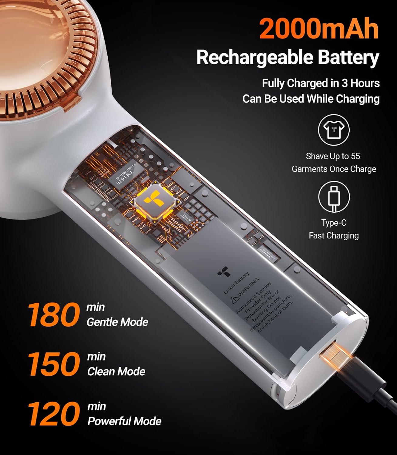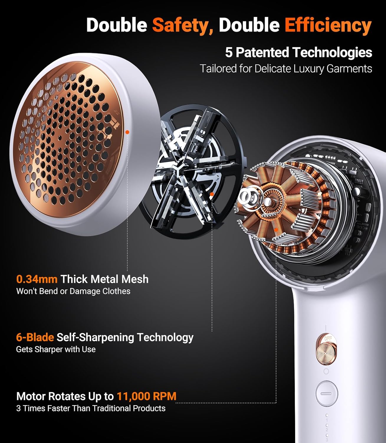• 🧣 [Triple Safety Protections] Protect your luxury clothing with triple safety protection mode. Once you open the net cover and lint container, the lint shaver rechargeable will automatically cut off the power to ensure the fabric's good condition and your safety. The electric lint remover for clothes maintains a safe distance between fabric and blades with the suck-shave technology, preventing clothing damage. Revitalize the fabrics in your cozy home with a brand new freshness.